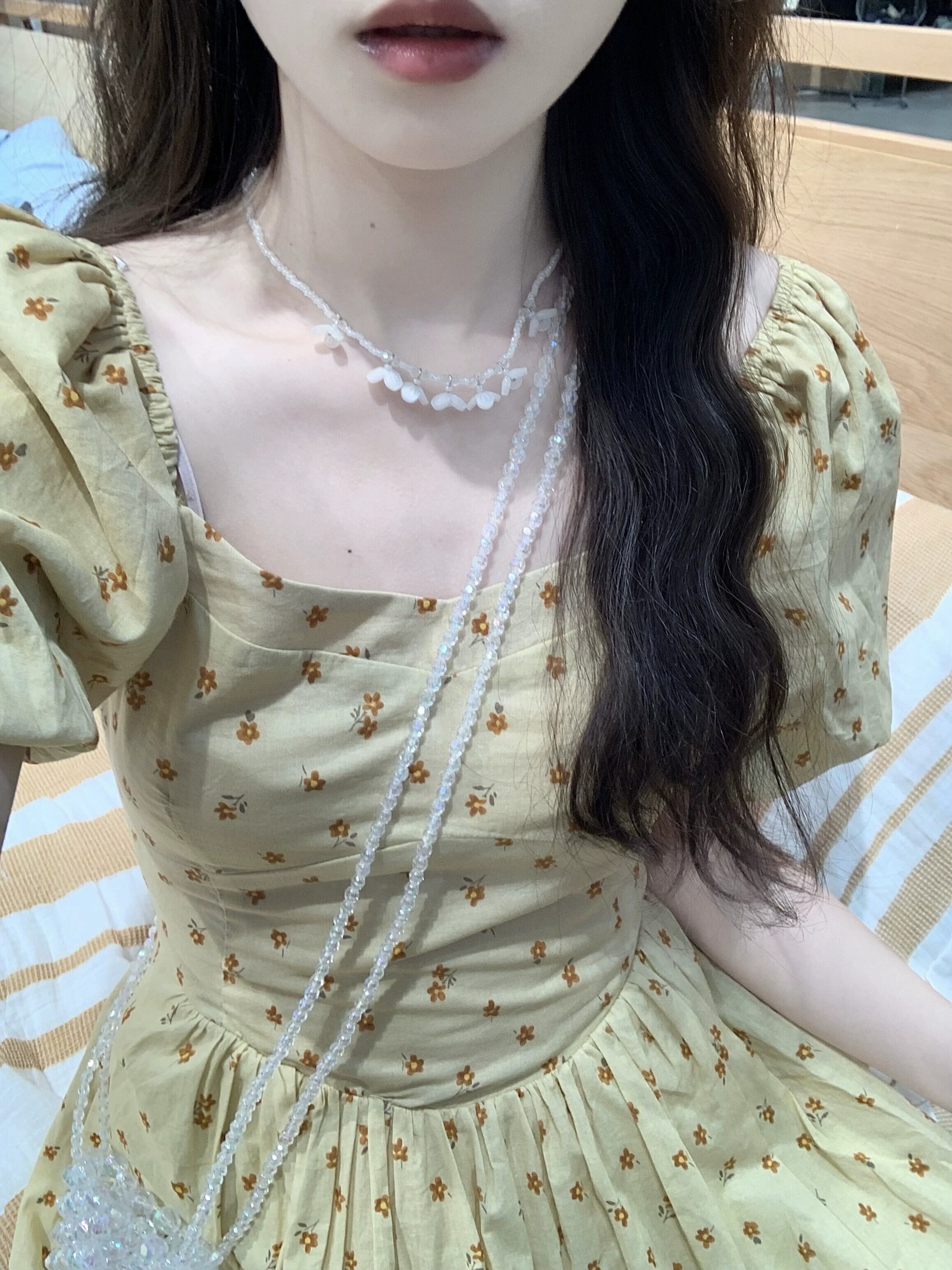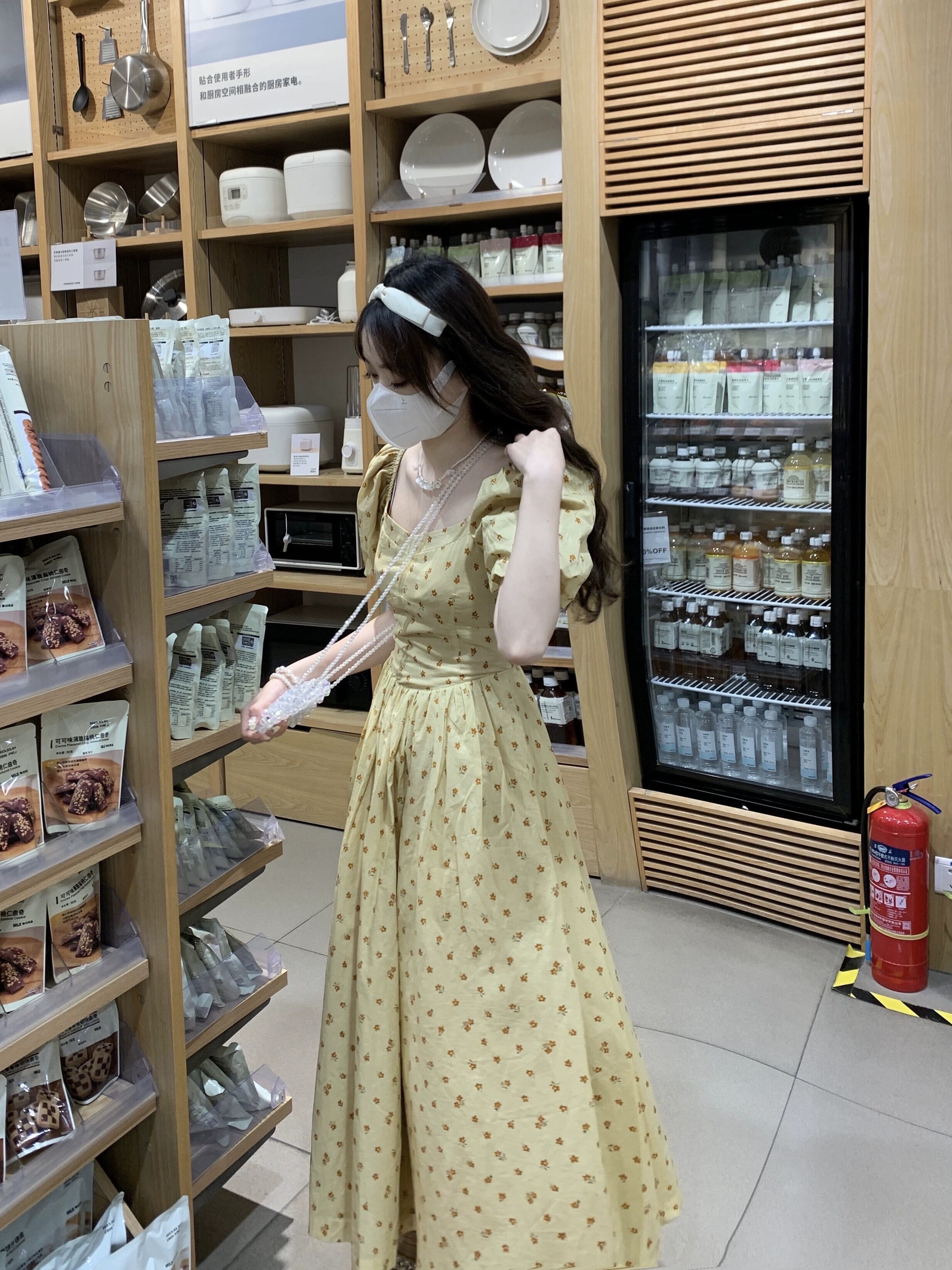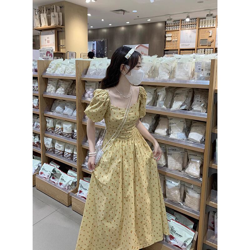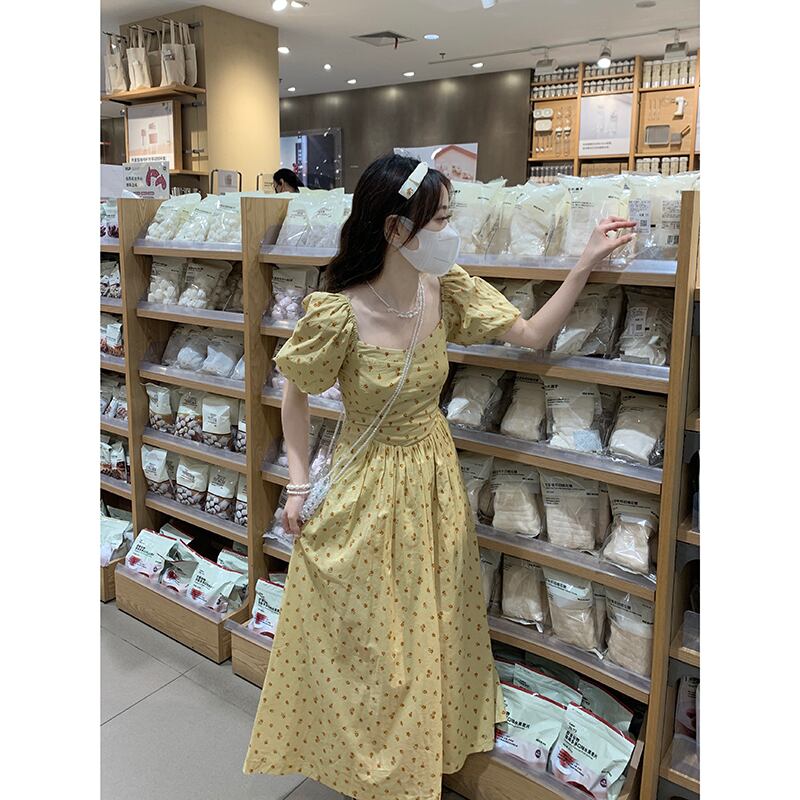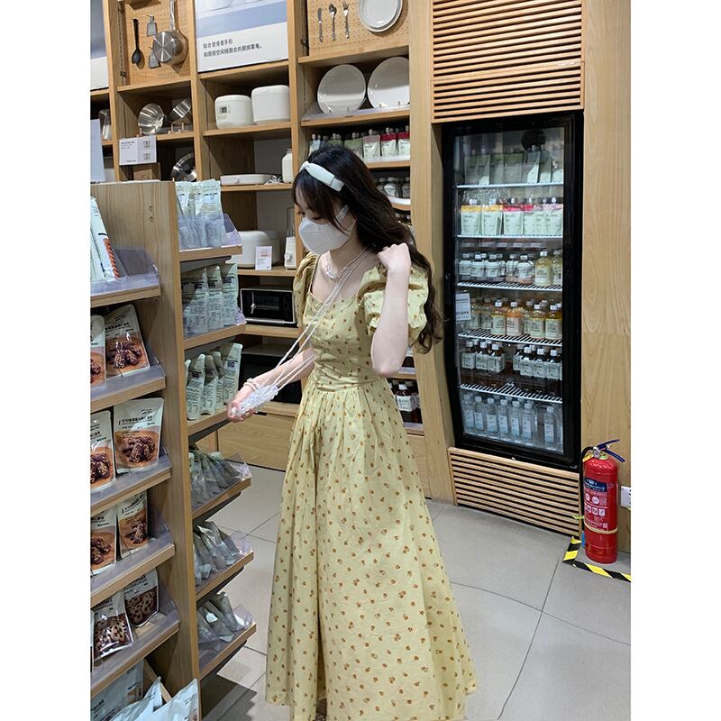 花柄パフスリーブドレスレディース夏フレンチスタイルウエスト痩身感覚スクエアネックミディアム丈スカートトレンディ サマー 夏物 スクウェア missk46415016295