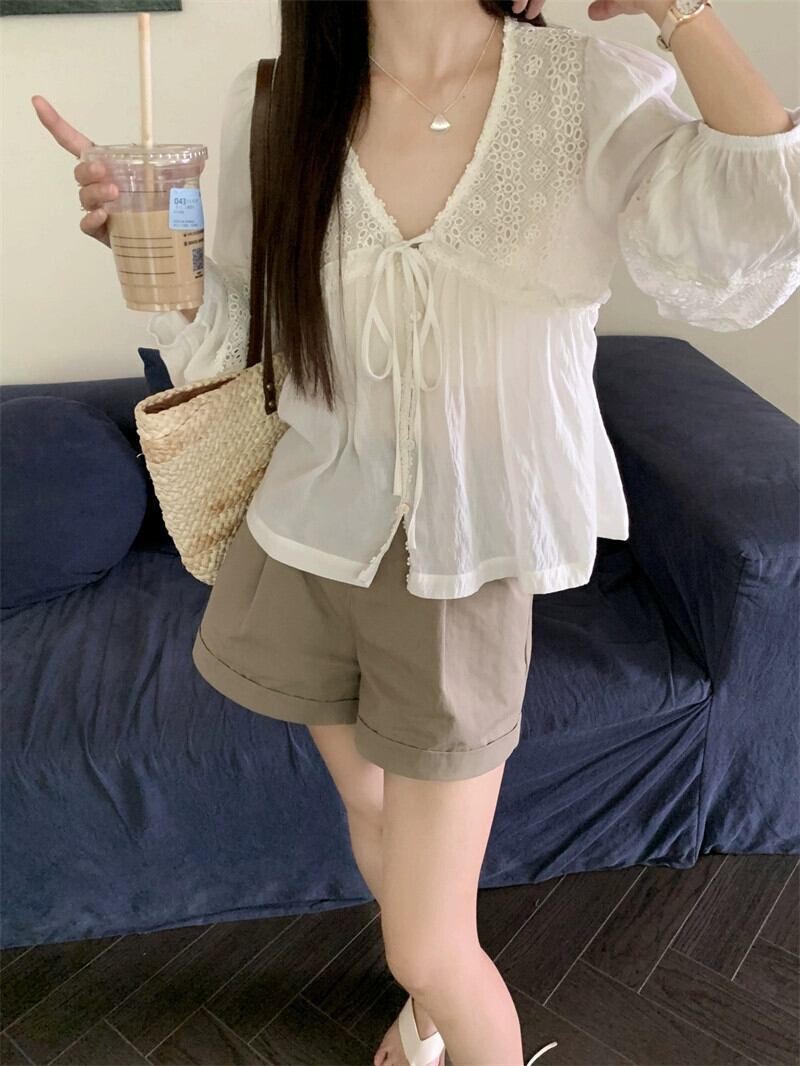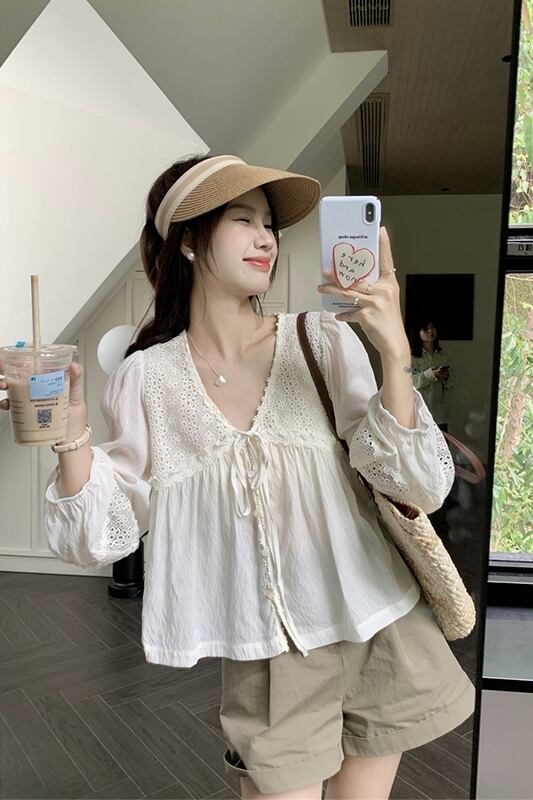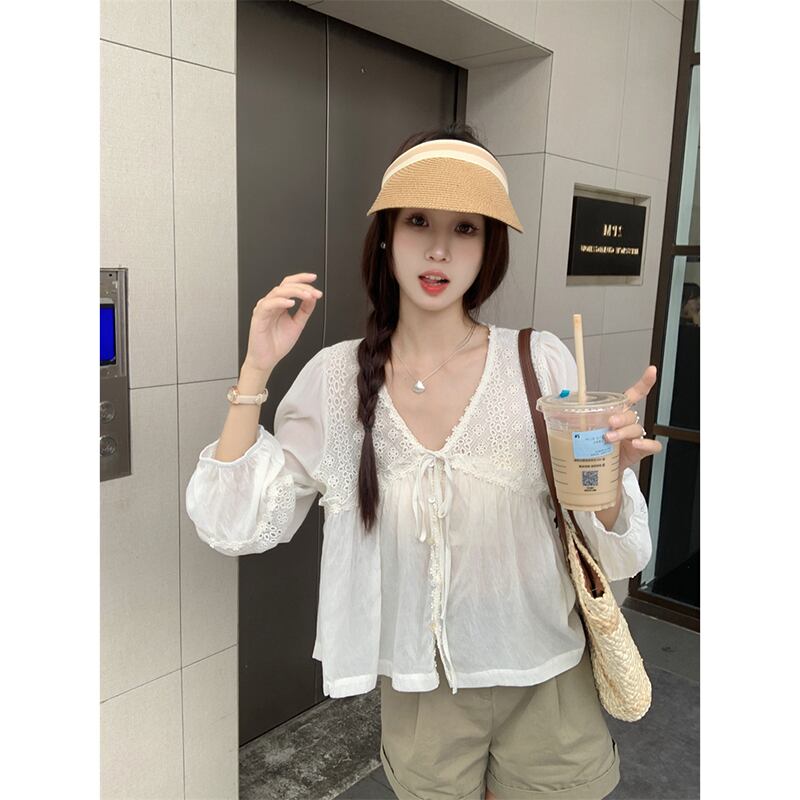 甘いレース中空長袖日焼け止めシャツトップレディース夏の高級感 V ネックネクタイ薄手のシャツシック ロング 大人ガーリー スウィート キュート カジュアル サマー 夏物 Vネック missk98159885909