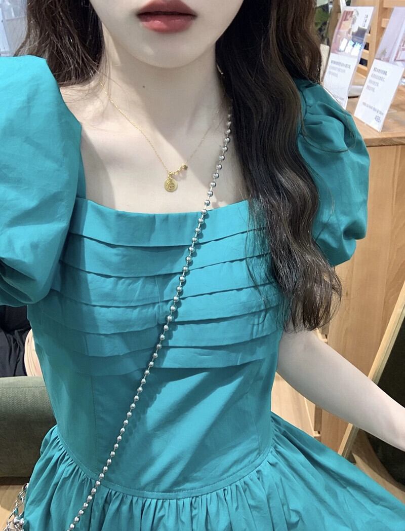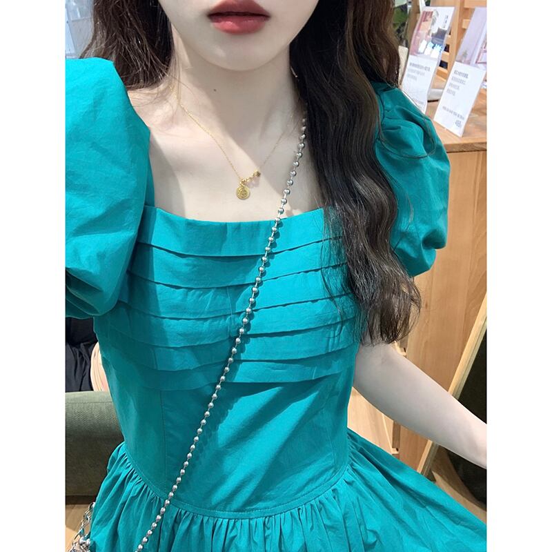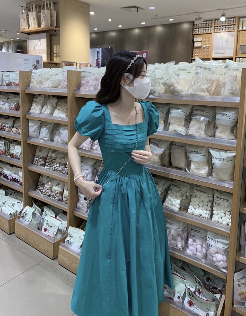 ドーパミンフレンチドレス夏レトロウエスト感覚小さなスクエアネックパフスリーブ妖精ロングドレス サマー 夏物 スクウェア missk53477506981