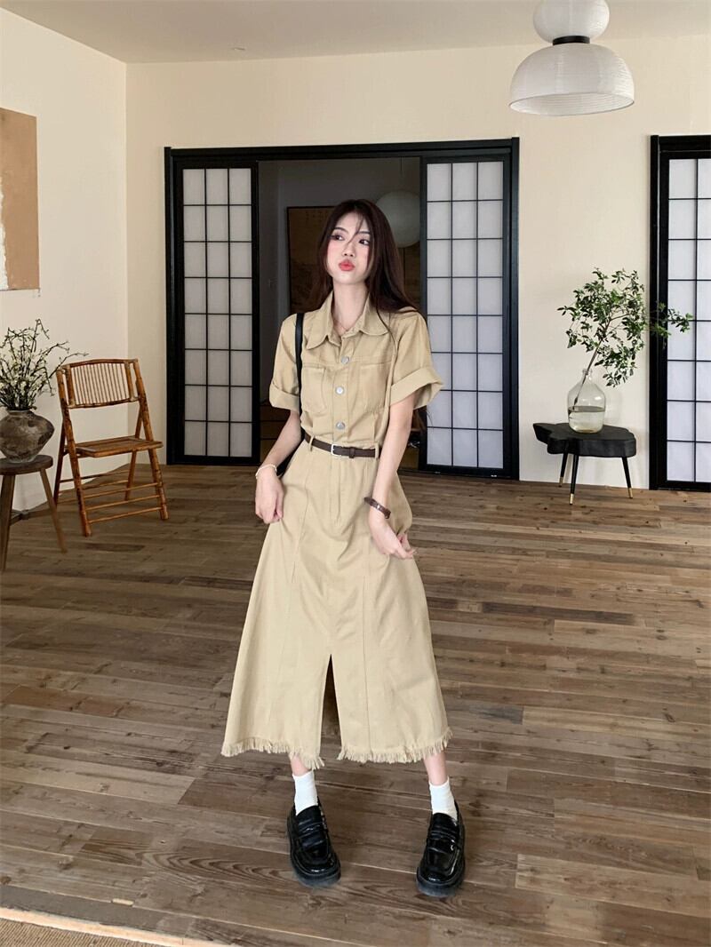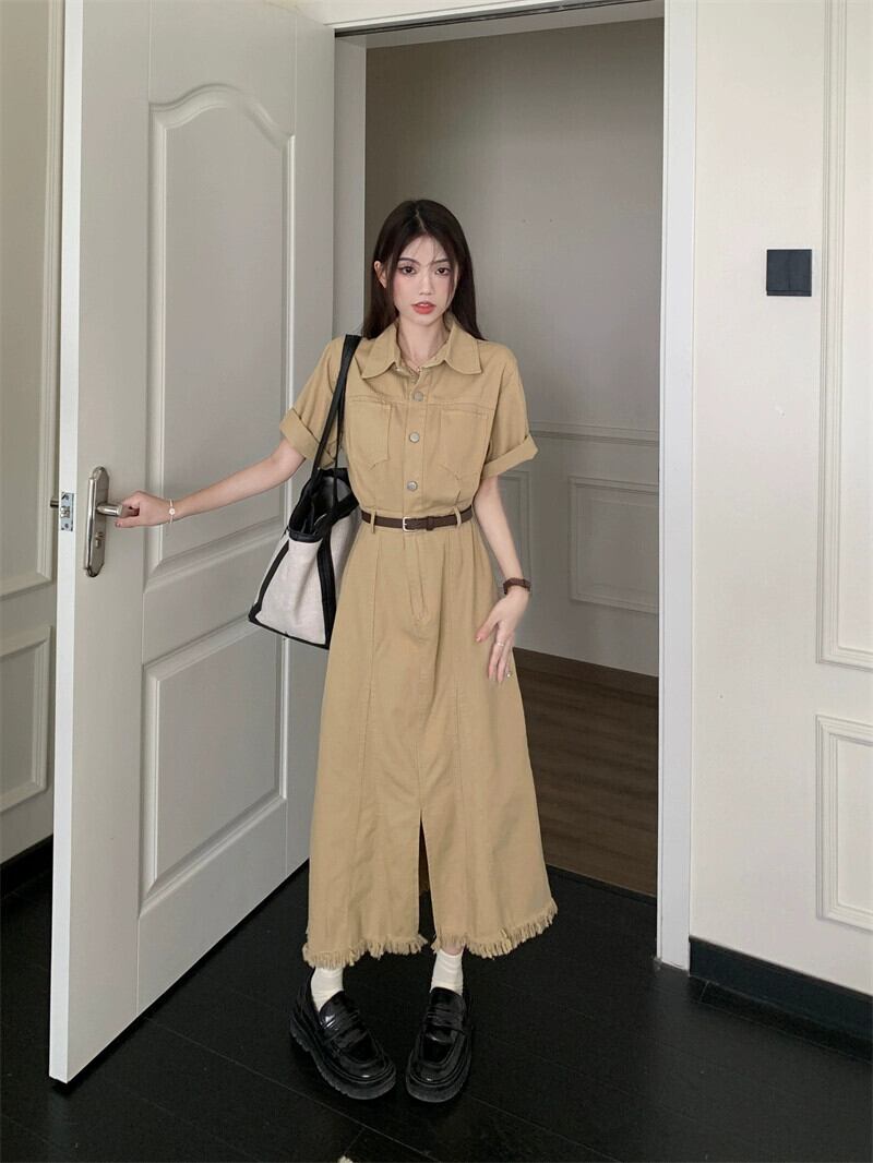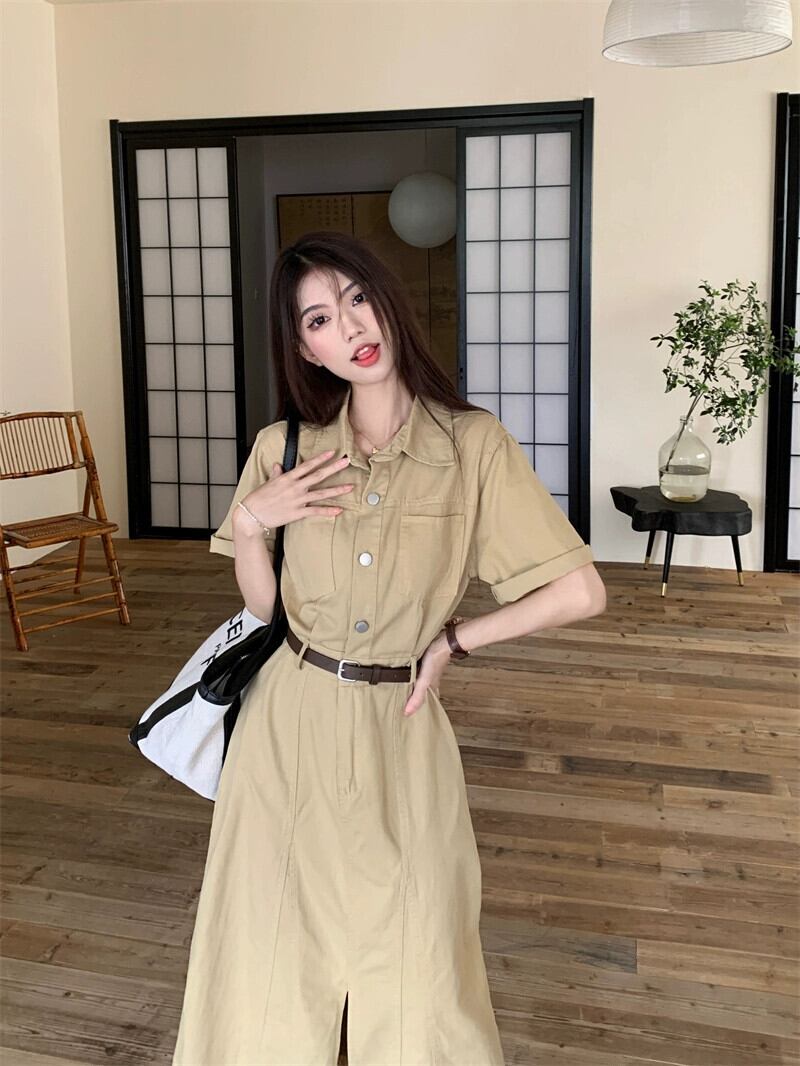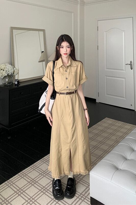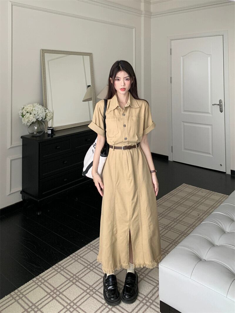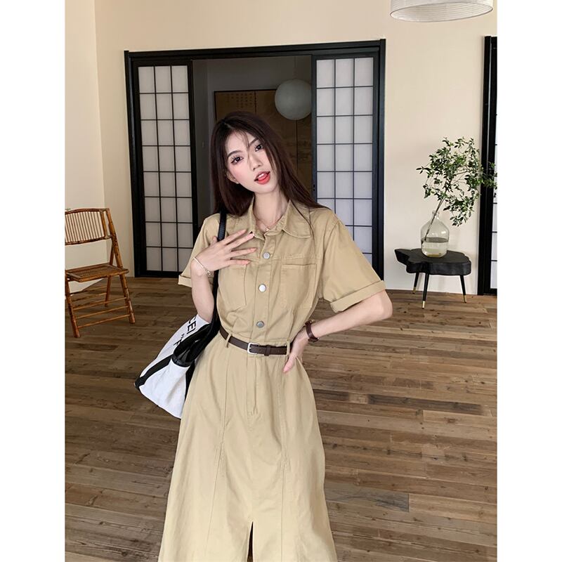 レトロラペルツーリングローエッジドレス夏フレンチウエストスリムシックスリットロングドレスシック サマー 夏物 missk32088612372