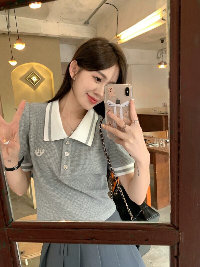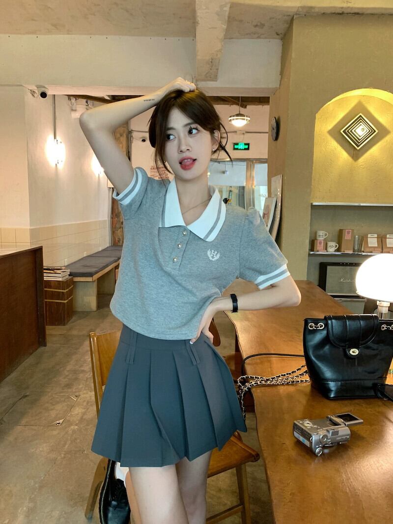 V ネック プレッピー ポロシャツ ファッション スーツ レディース 夏年齢軽減カジュアル半袖ラペル T シャツ プリーツ スカート サマー 夏物 Vネック Tシャツ missk23801925344