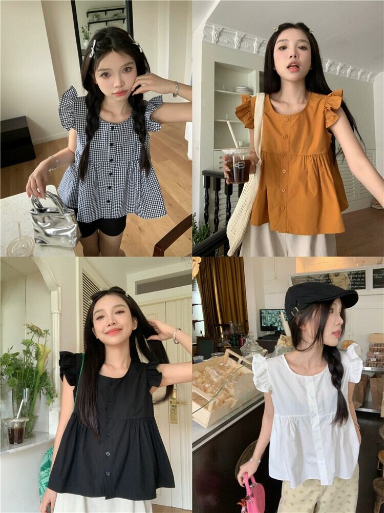 蓮の葉縁フライングスリーブシャツ、夏デザインセンス、ニッチ、年齢軽減、エインスタイル、ショートAラインドールシャツ、トップス、婦人服 サマー 夏物 missk23526430484