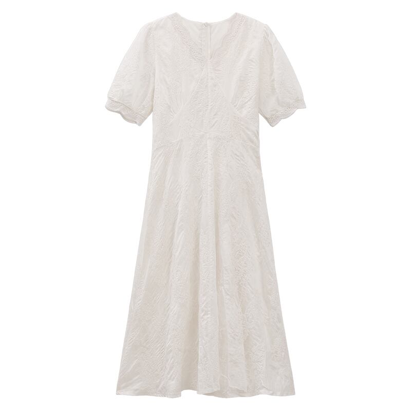 -エンドレースパフスリーブドレス夏フランス気質ウエストデザインセンスVネック白ロングスカート女性ファッション ホワイト サマー 夏物 missk74806836158