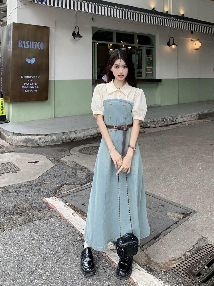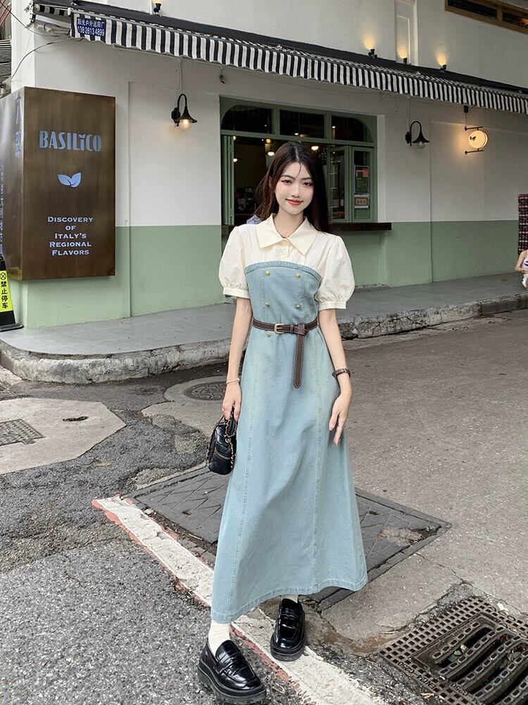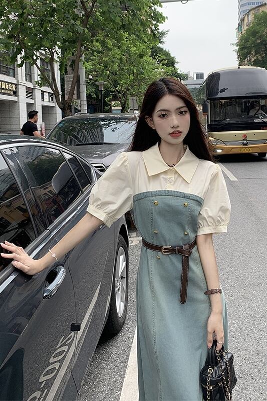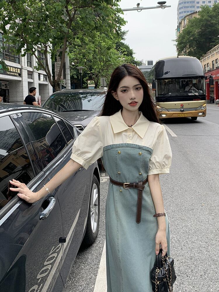 フレンチフェイクツーピースデニムドレス夏の新しいスタイル小さな香り風ウエストシックなミッドレングスパフスリーブロングスカート女性 サマー 夏物 missk66713074500