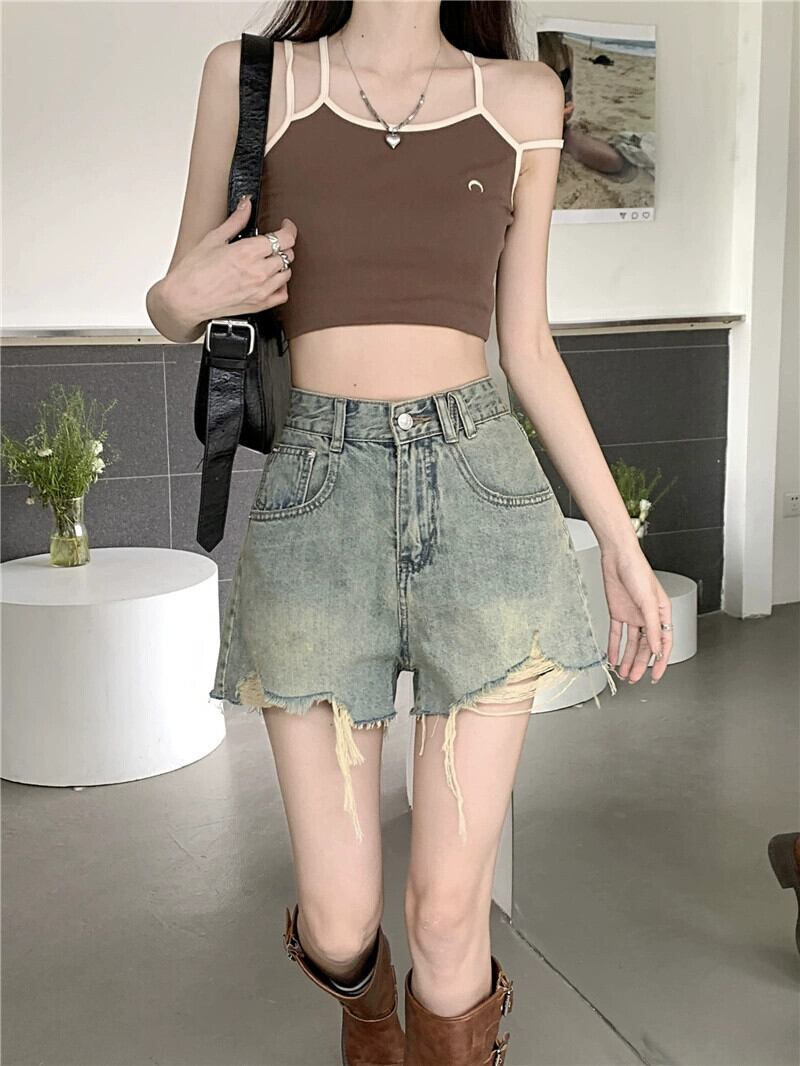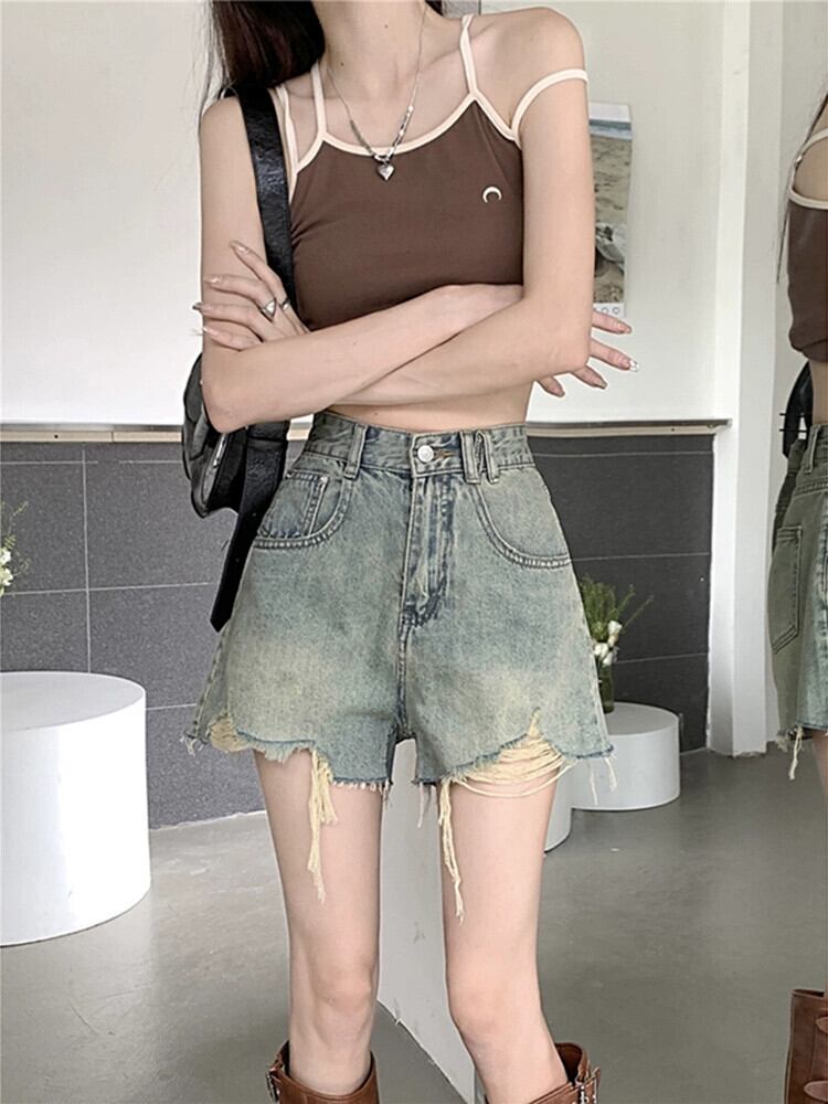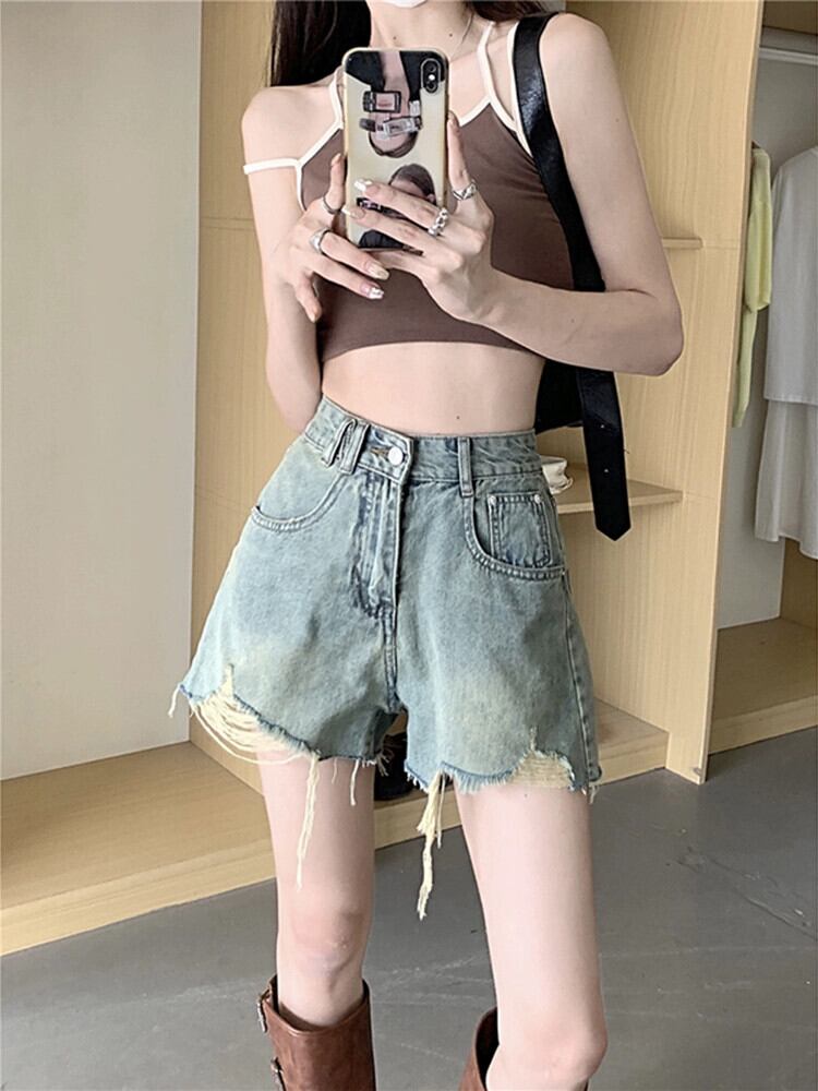 リップドデニムショーツ レディース 2023年夏新作 レトロ ハイウエスト 薄手 デザイン感 Aライン ワイドレッグパンツスタイル ハイウェスト サマー 夏物 ブルマー missk4589721290