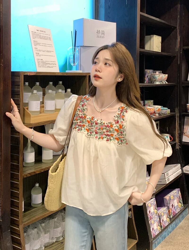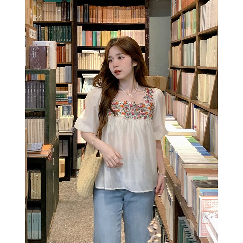 エスニックスタイル刺繍花スクエアカラーシャツ女性の夏の 2023 新しいシフォンステッチバブル半袖鎖骨トップ サマー 夏物 フラワーデザイン スクウェア missk63648324474