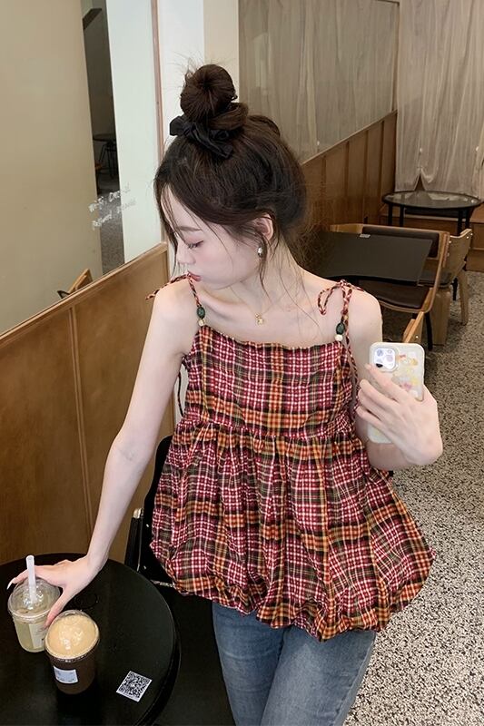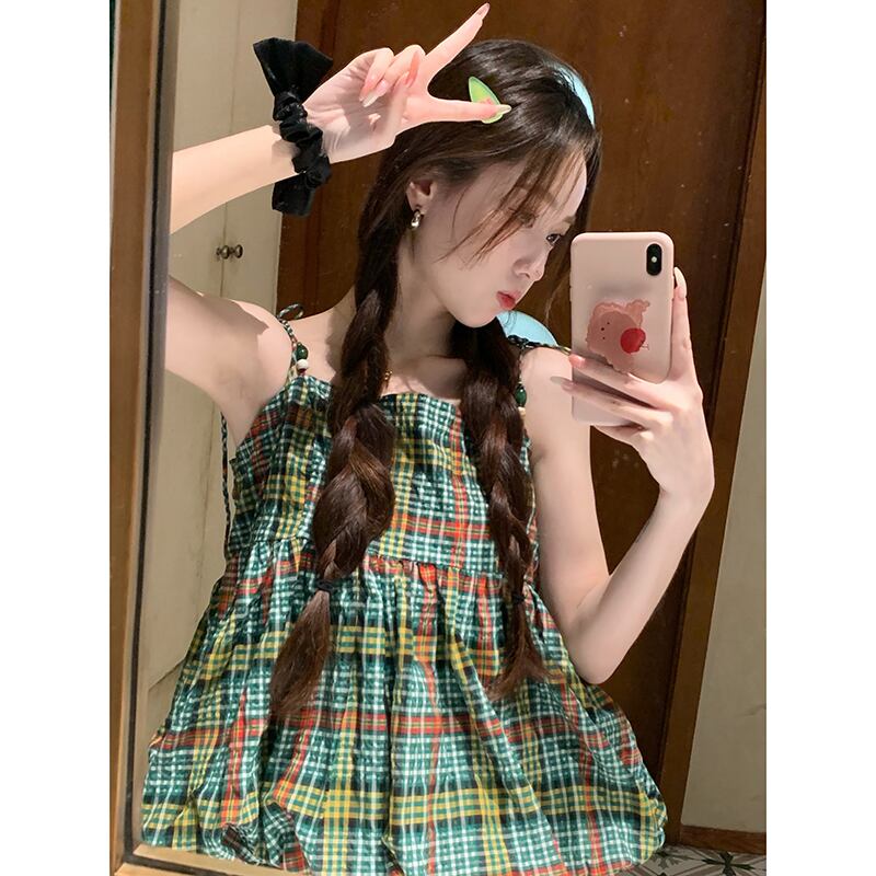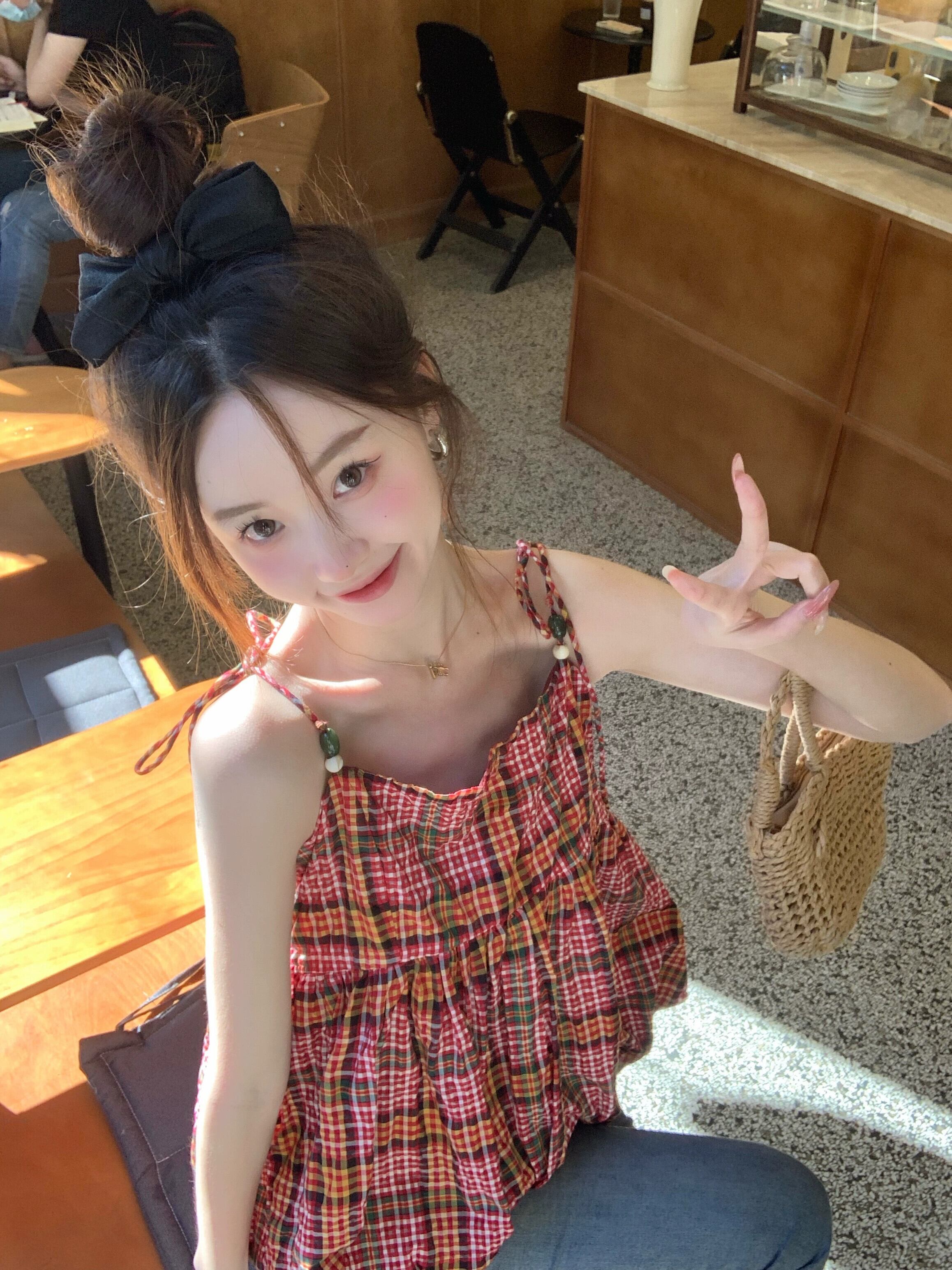 2023 夏の新しいフレンチスタイルの甘いスタイルニッチ包帯チェック柄ウエスト痩身オールマッチチューブトップキャミソール女性 大人ガーリー スウィート キュート カジュアル サマー 夏物 missk27364612223