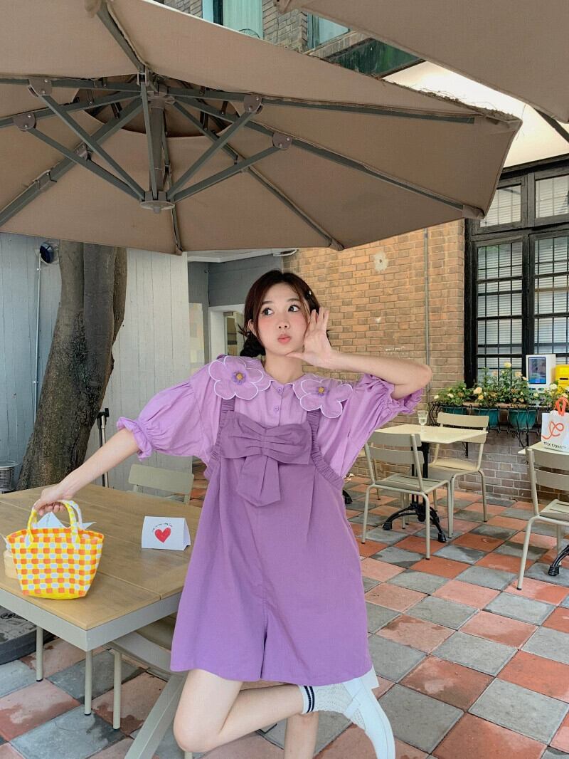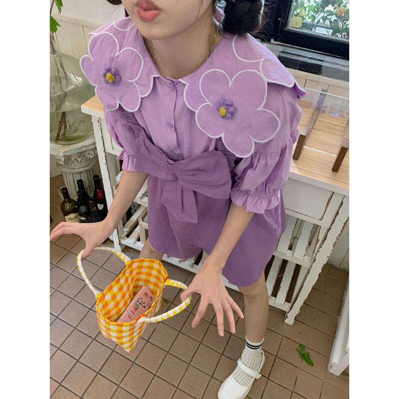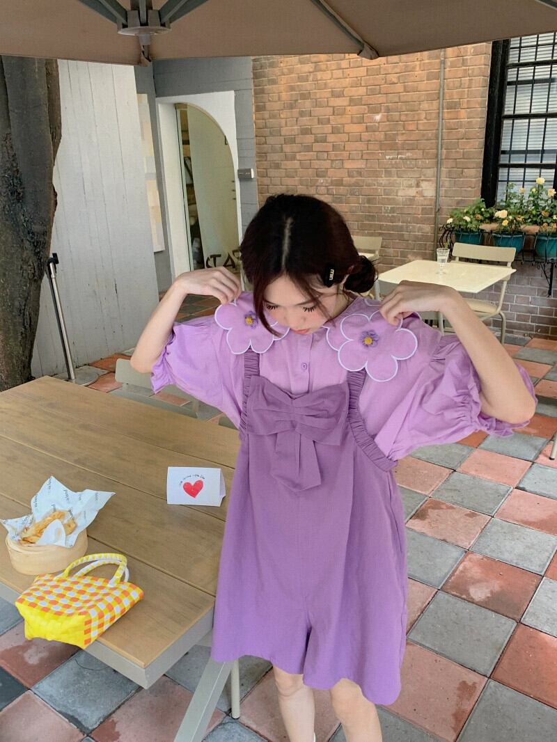 甘い花デザインセンス年齢削減パフスリーブシャツ弓ストラップショーツ女性の夏の新しい紫色のスーツ リボン 大人ガーリー スウィート キュート カジュアル サマー 夏物 ブルマー フラワーデザイン パープル missk42842904519