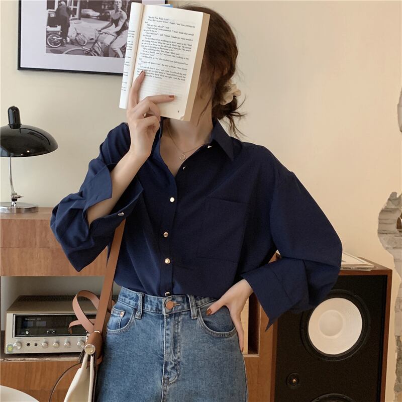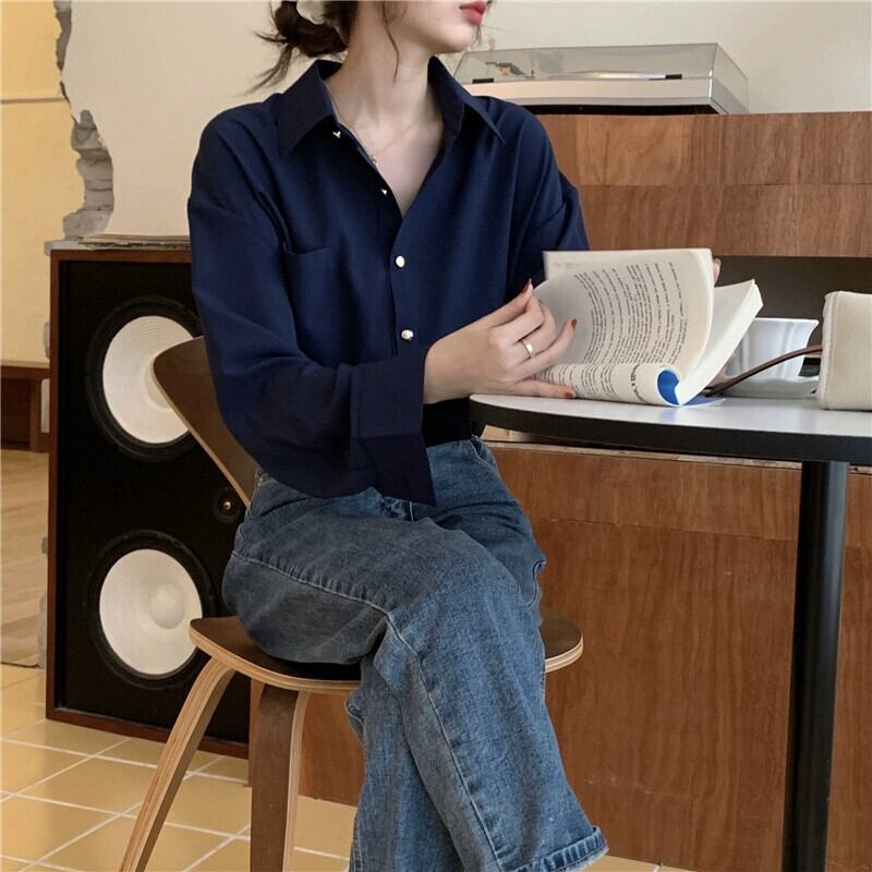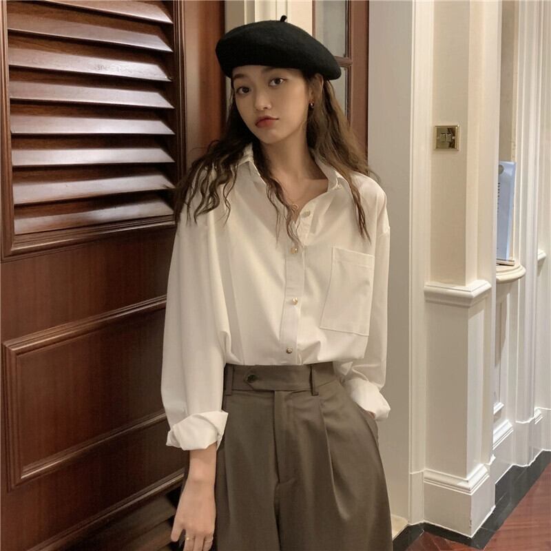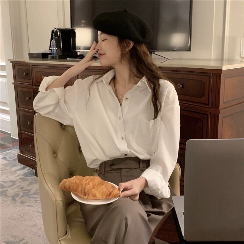 ポロカラー白シャツ女性の夏の 2023 新しいレトロ香港風味ルーズミッドレングスセクションオールマッチ長袖カジュアルトップ ロング ホワイト サマー 夏物 missk89137364698