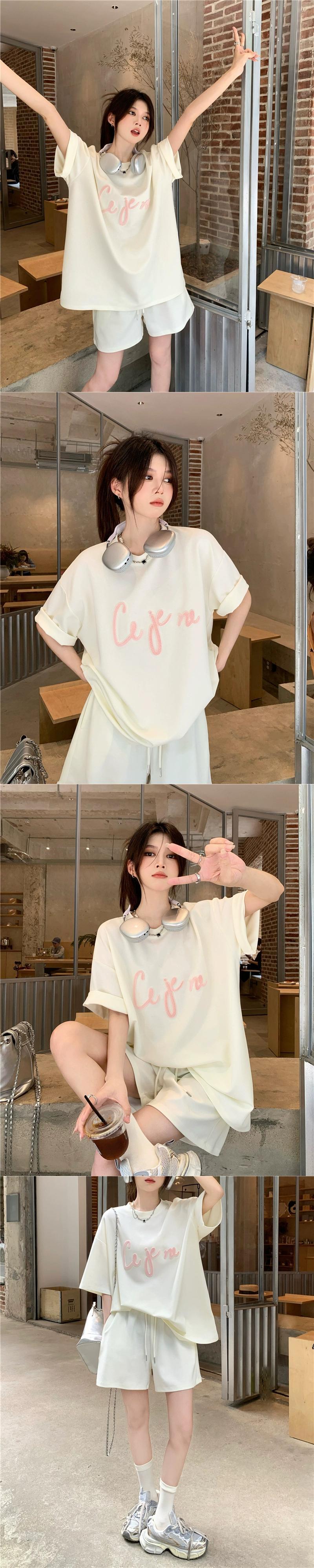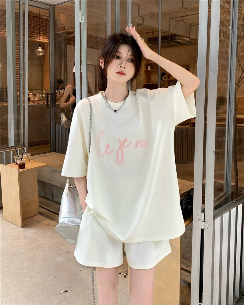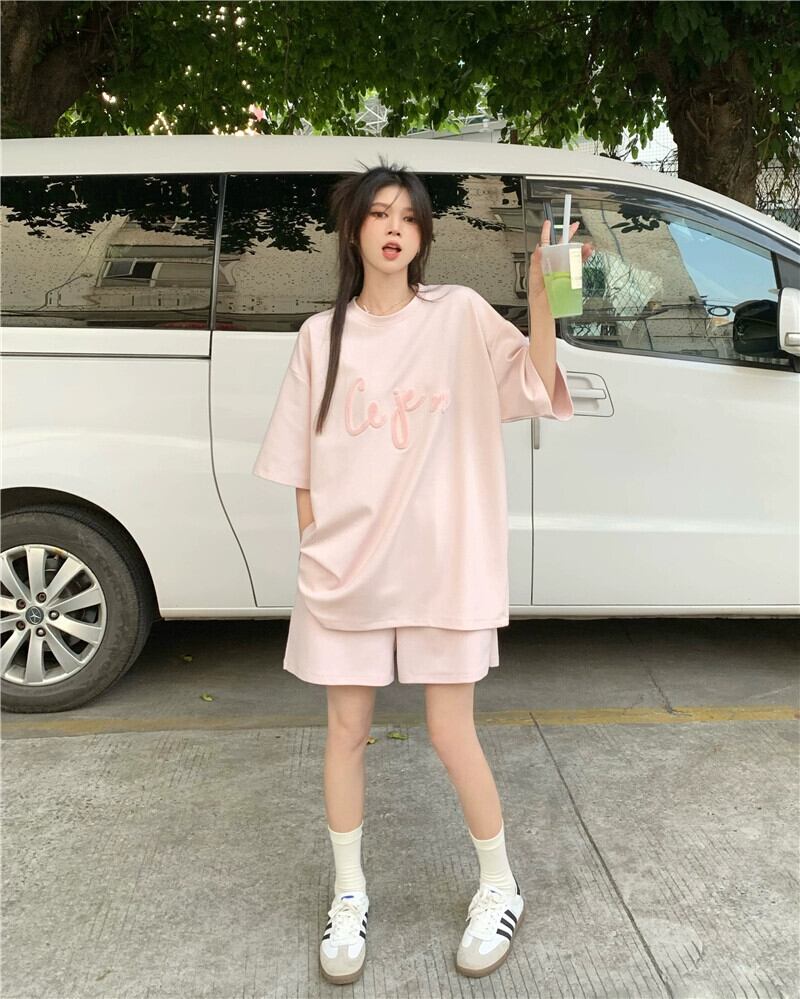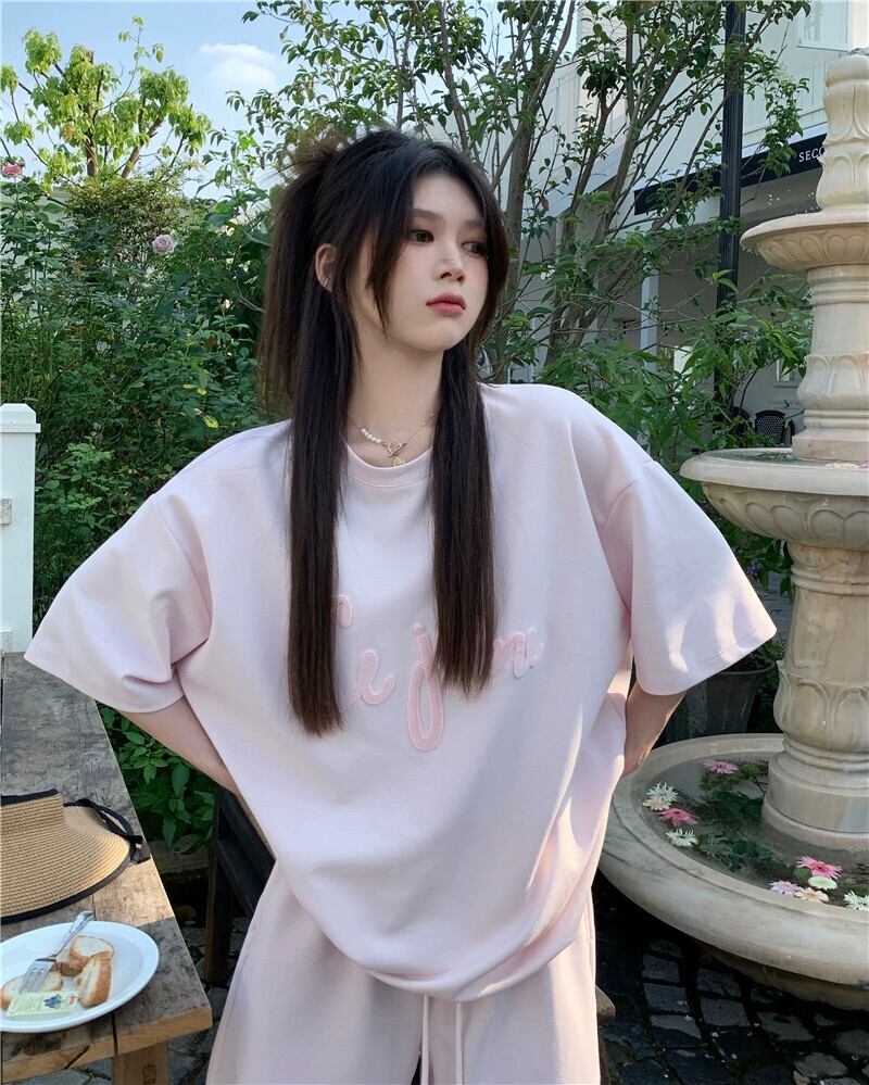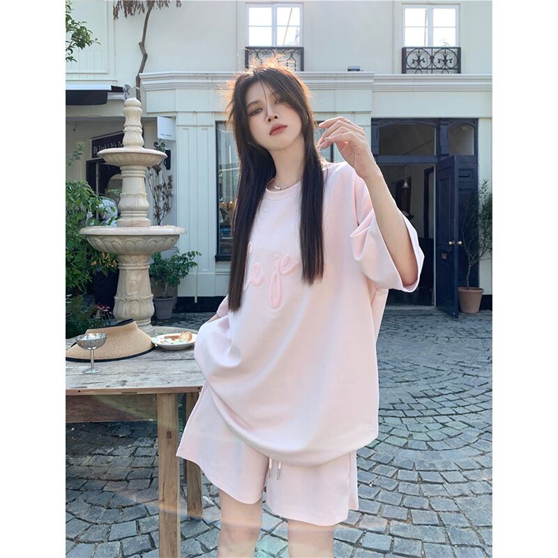 怠惰なスタイルのカジュアルなピンクのスーツルーズプリント半袖 T シャツハイウエストワイドレッグショーツ女性の夏のツーピーストレンド ハイウェスト サマー 夏物 ブルマー Tシャツ missk71689719741