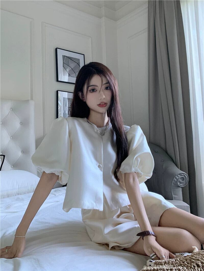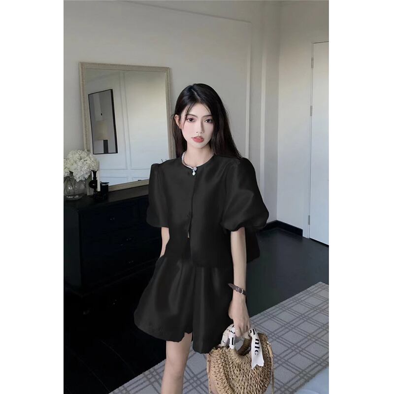 中国風レトロバブル半袖シャツトップハイウエストワイドレッグショーツ女性の夏の新しいハイエンドツーピースセット ハイウェスト サマー 夏物 ブルマー missk88063964208