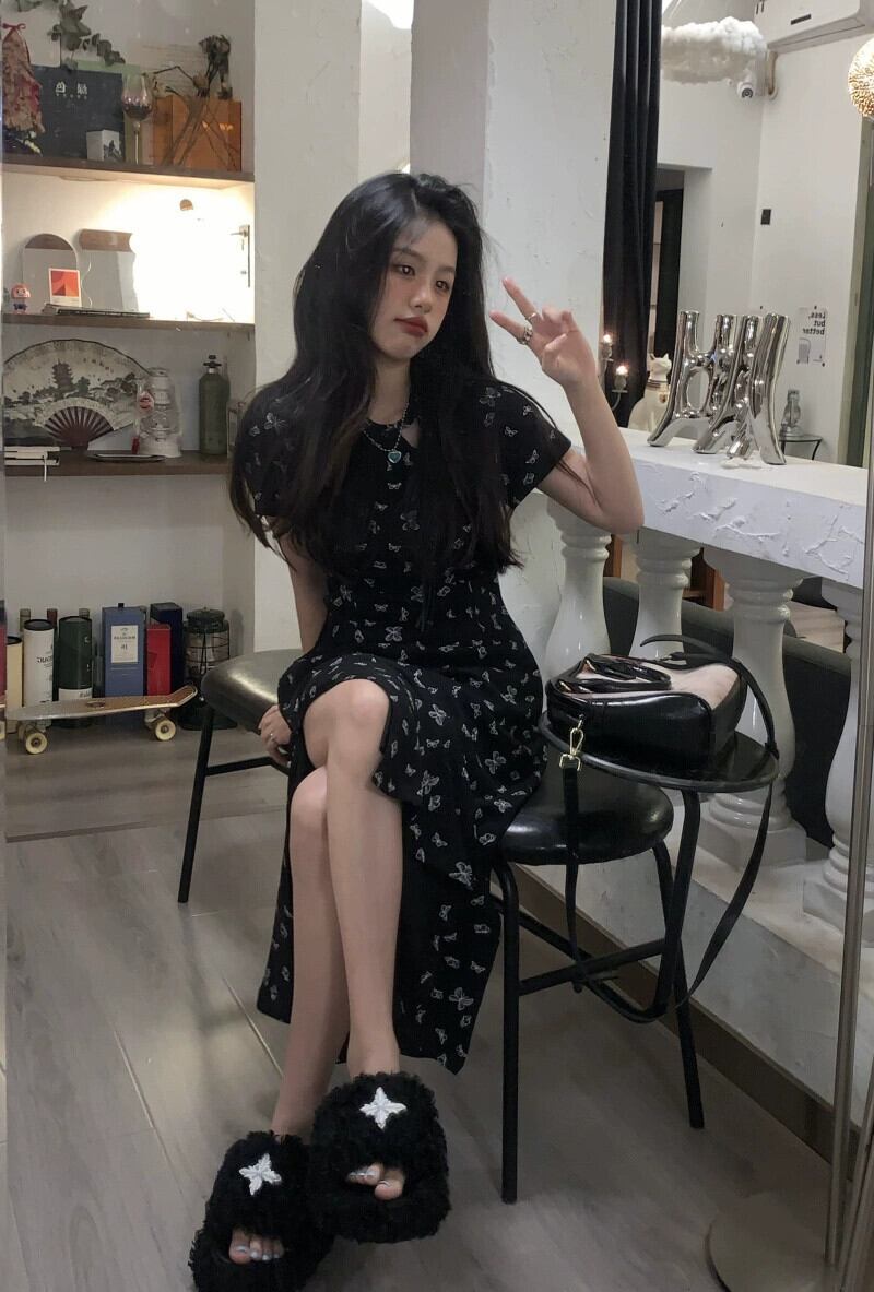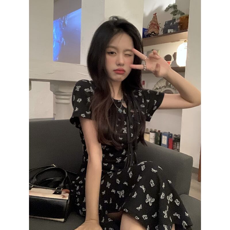 2023 夏の新しい気質ファッションハイウエストミッドレングススリット薄いバックレスプリント半袖ドレス女性の潮 ハイウェスト サマー 夏物 missk26147265094