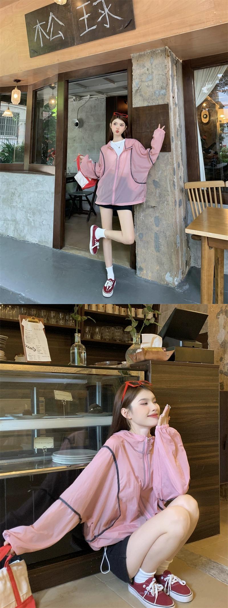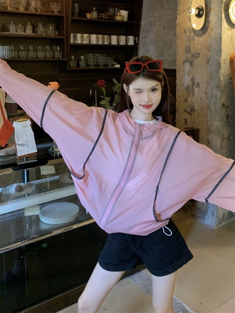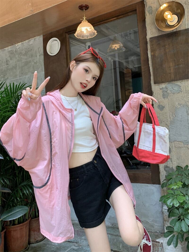通気性長袖日焼け止めシャツ夏の新しいルーズピンクフード付きコントラストカラージッパー空調シャツジャケットジャケット女性 ロング サマー 夏物 missk26588679594