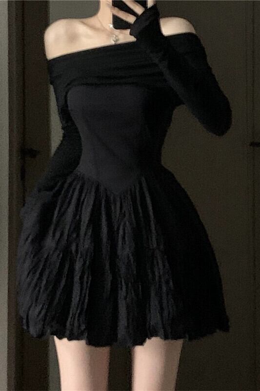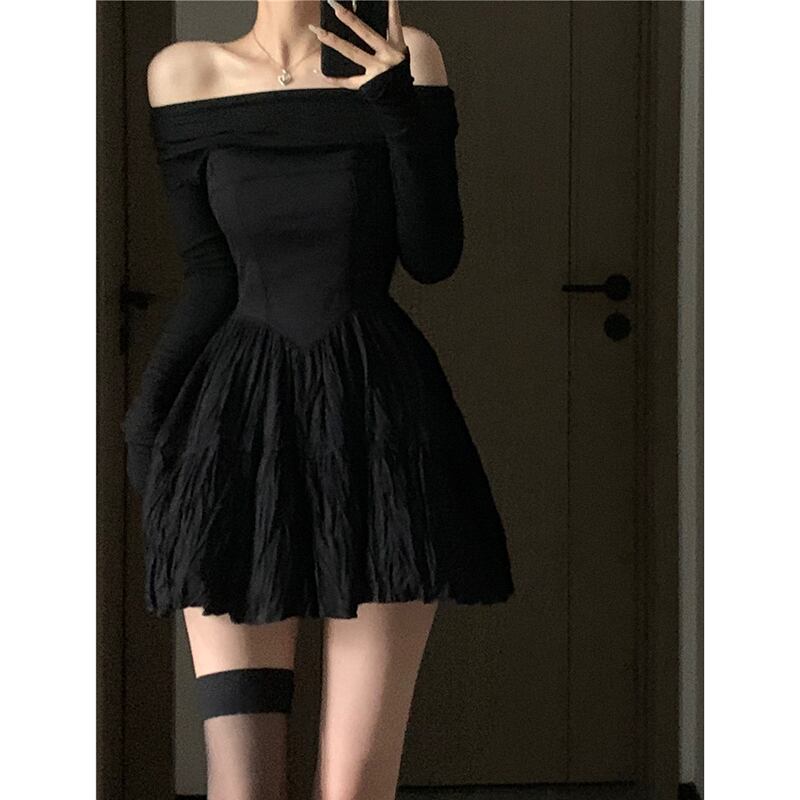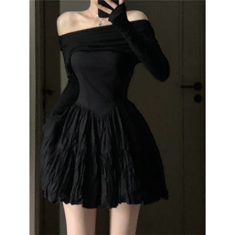 ワンショルダー長袖ドレスの女性の夏の 2023 新しいフレンチスタイルセレブスタイルウエスト痩身ふわふわリトルブラックスカート ロング サマー 夏物 missk95997329280