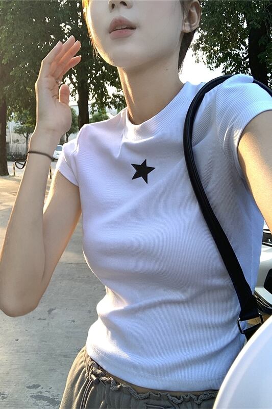 甘辛スタープリントフロントショルダー半袖Tシャツ夏の新バージョンスリムで薄いショートホワイトトップ婦人服 大人ガーリー スウィート キュート カジュアル サマー 夏物 missk76419913533