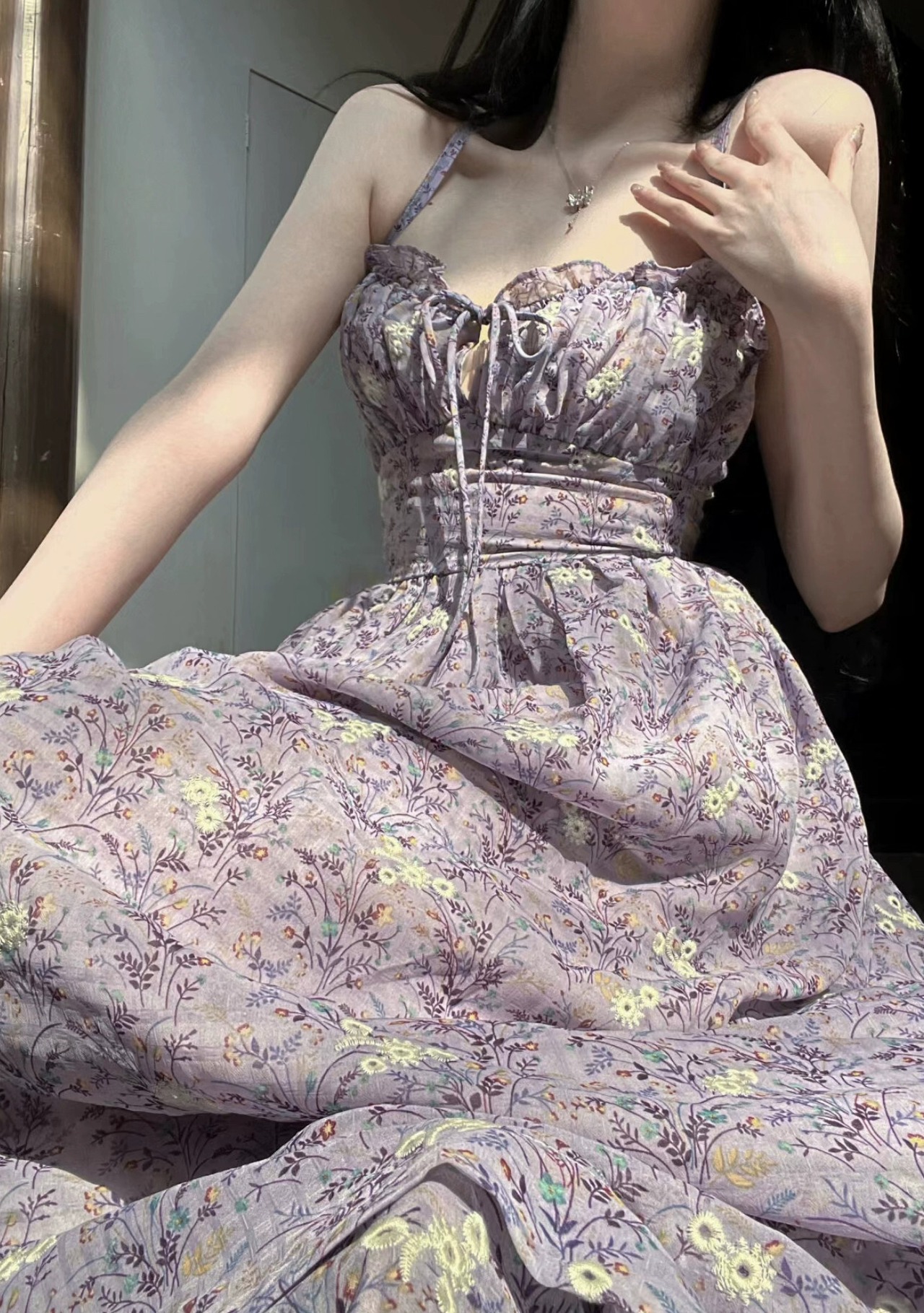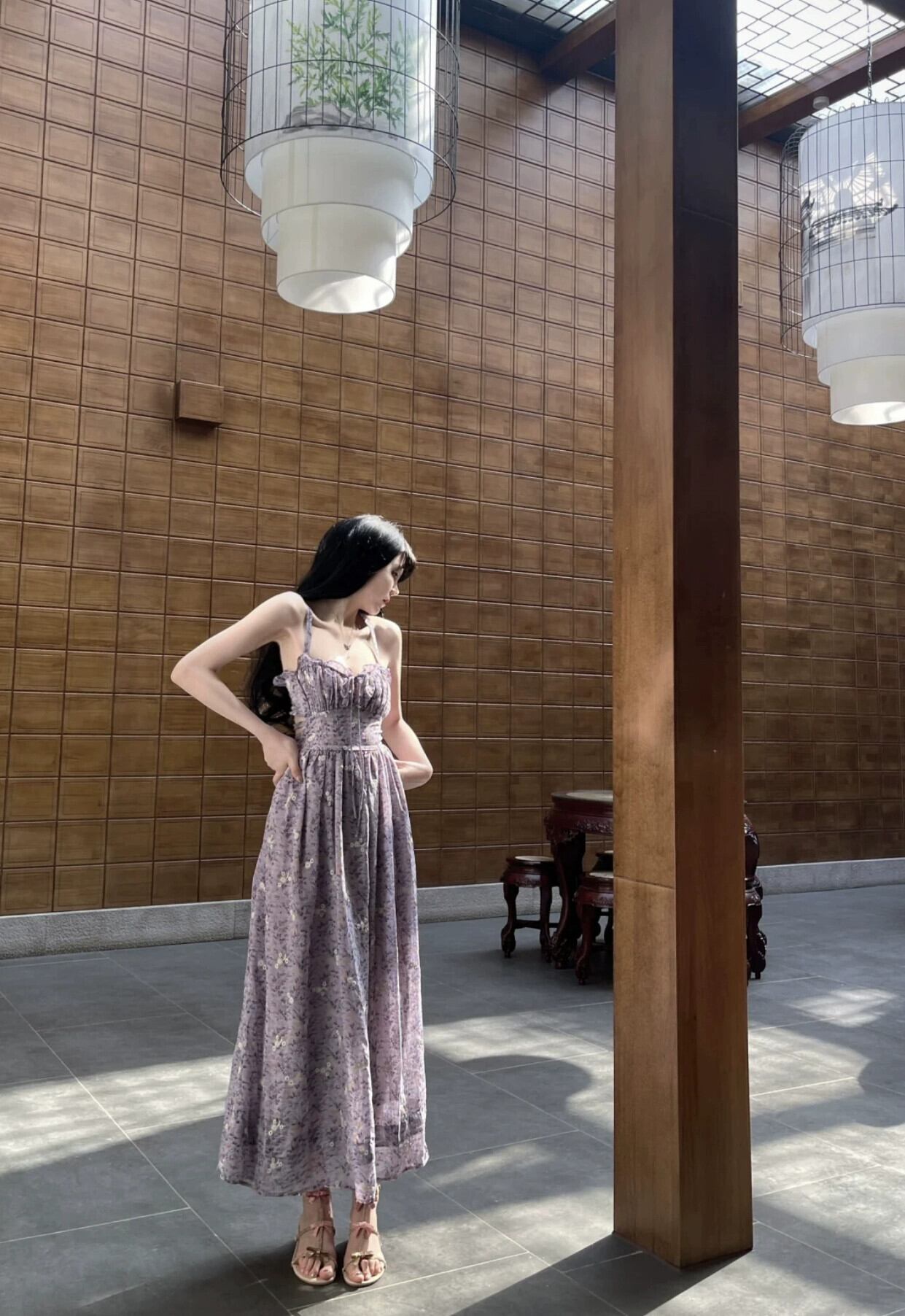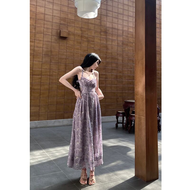 フレンチプリーツ花柄スリングドレスレディース夏新作甘辛ウエストレースステッチデザインセンスロングスカート 大人ガーリー スウィート キュート カジュアル サマー 夏物 missk74821635291