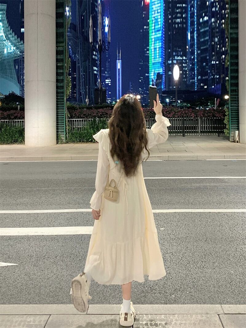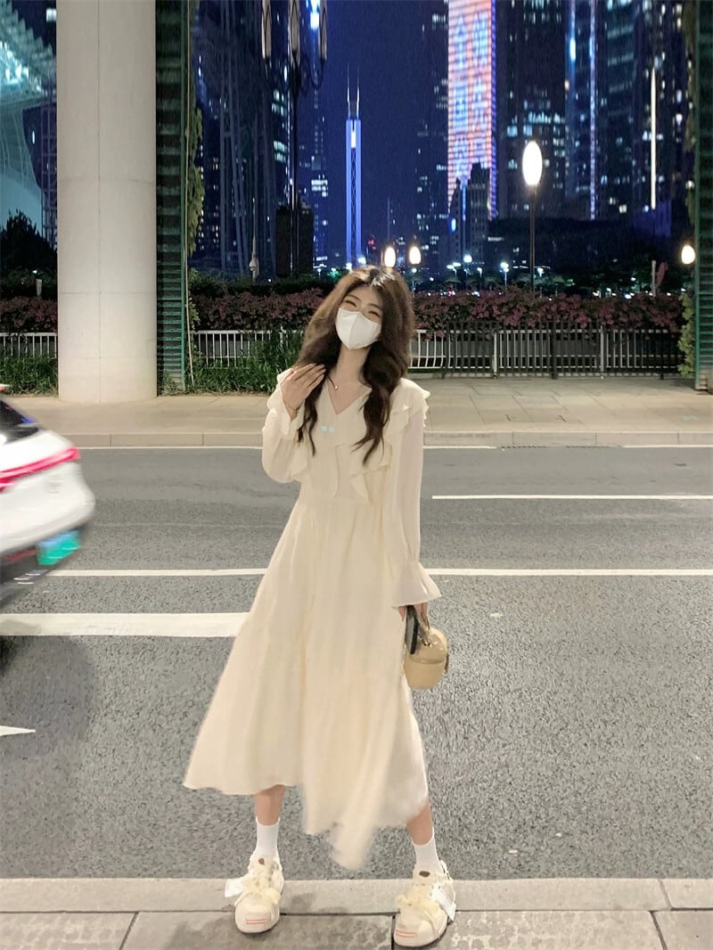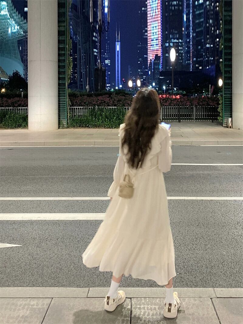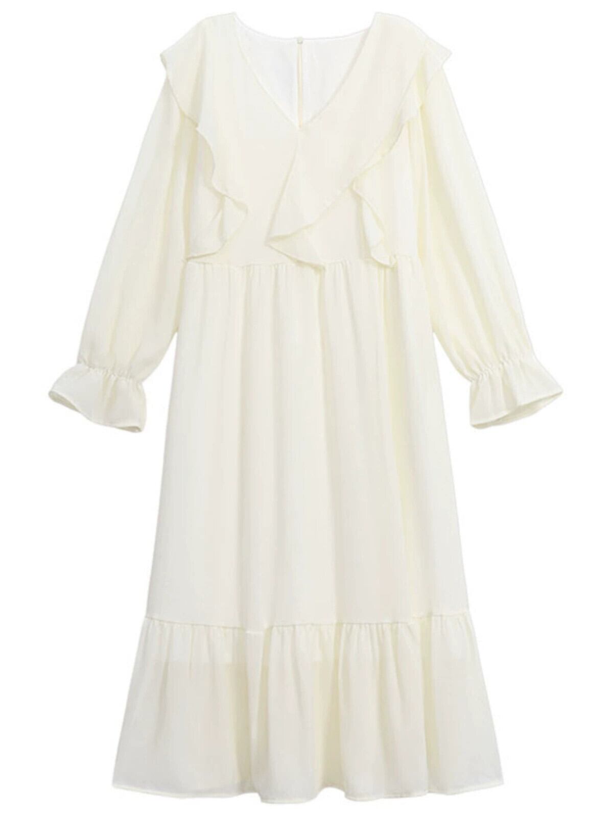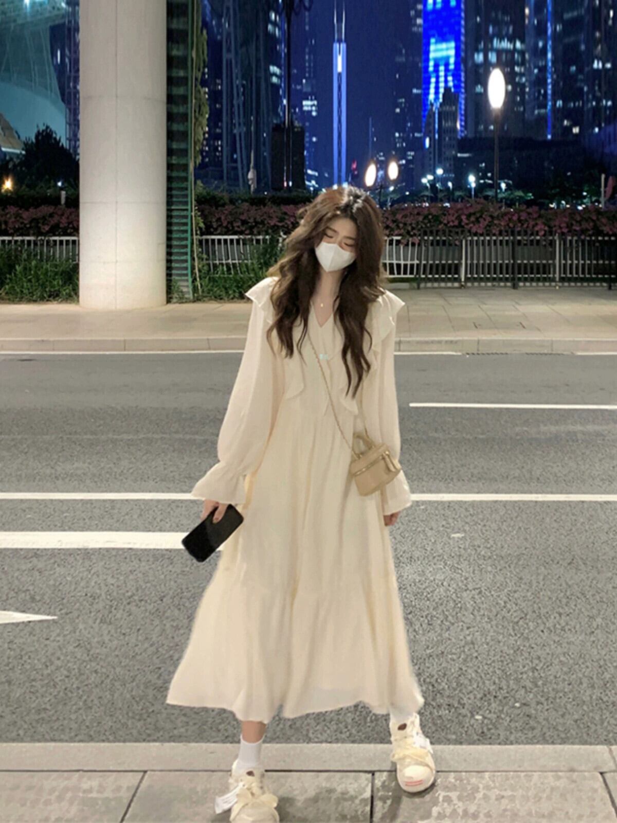 優しい風 V ネック長袖ドレスの女性の 2023 夏の新しいスタイルのフリル高品質ウエスト痩身ロングスカート ラッフル サマー 夏物 Vネック missk32754538244