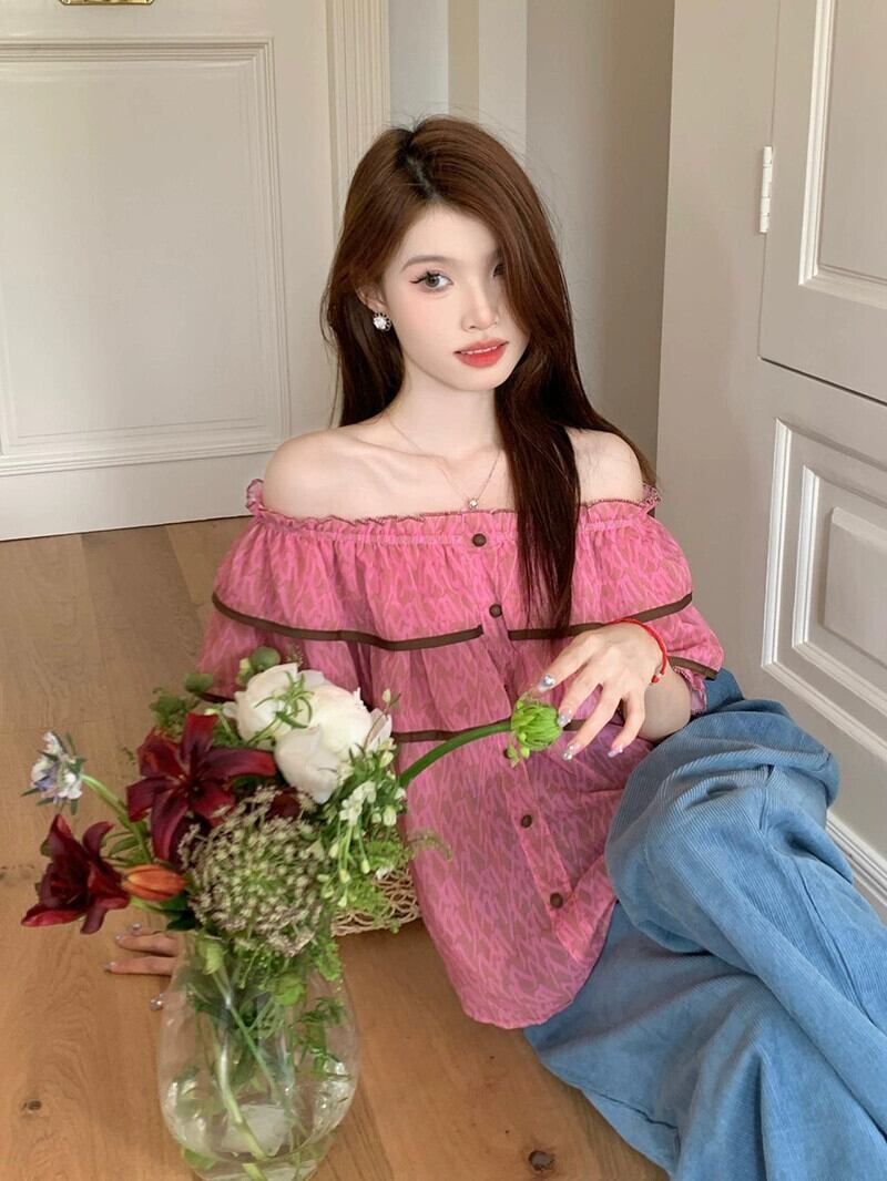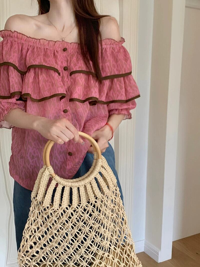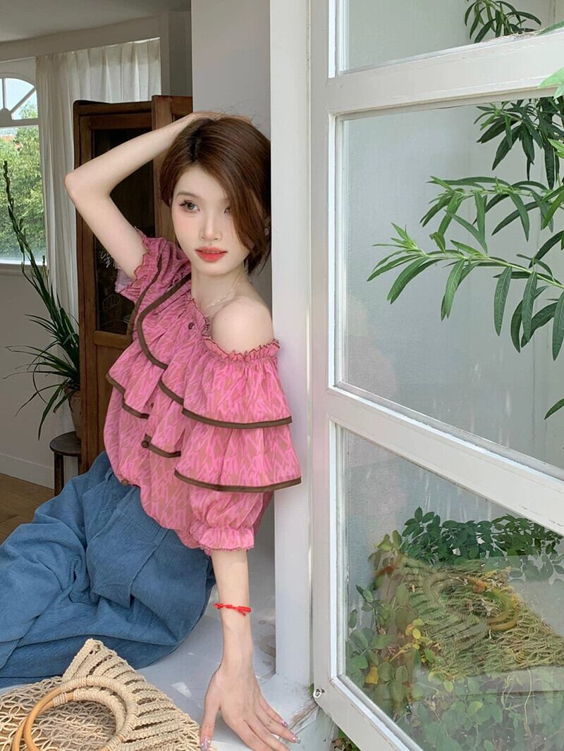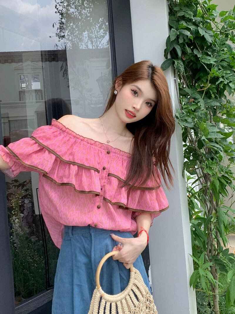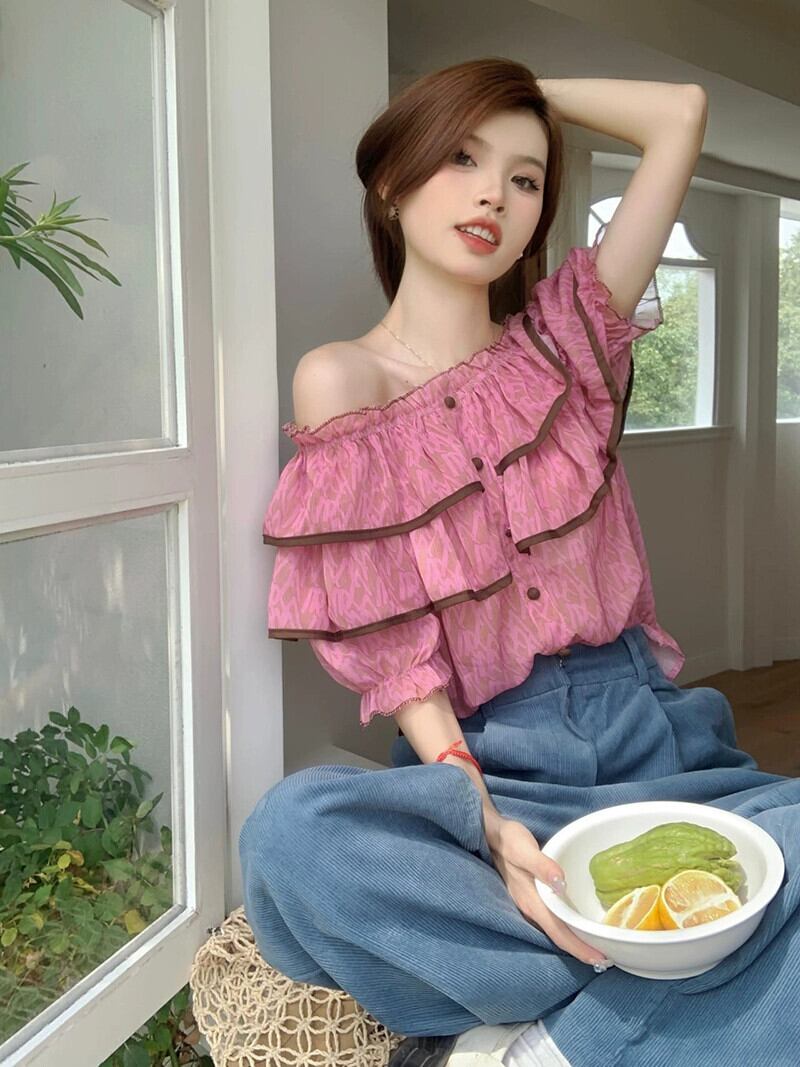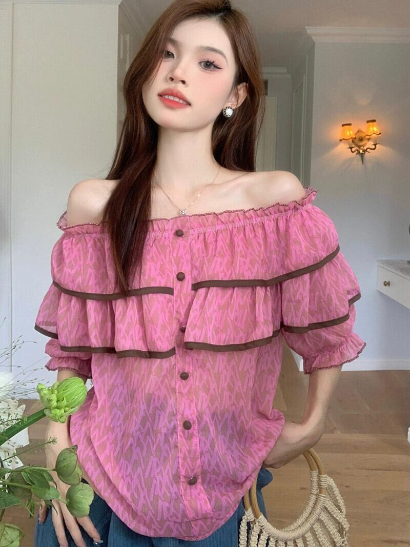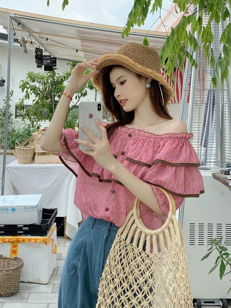 一言襟ストラップレス半袖シャツ女性の夏の新しいフレンチスタイルニッチフラウンスシックなスリム気質トップトレンド サマー 夏物 missk99337323718
