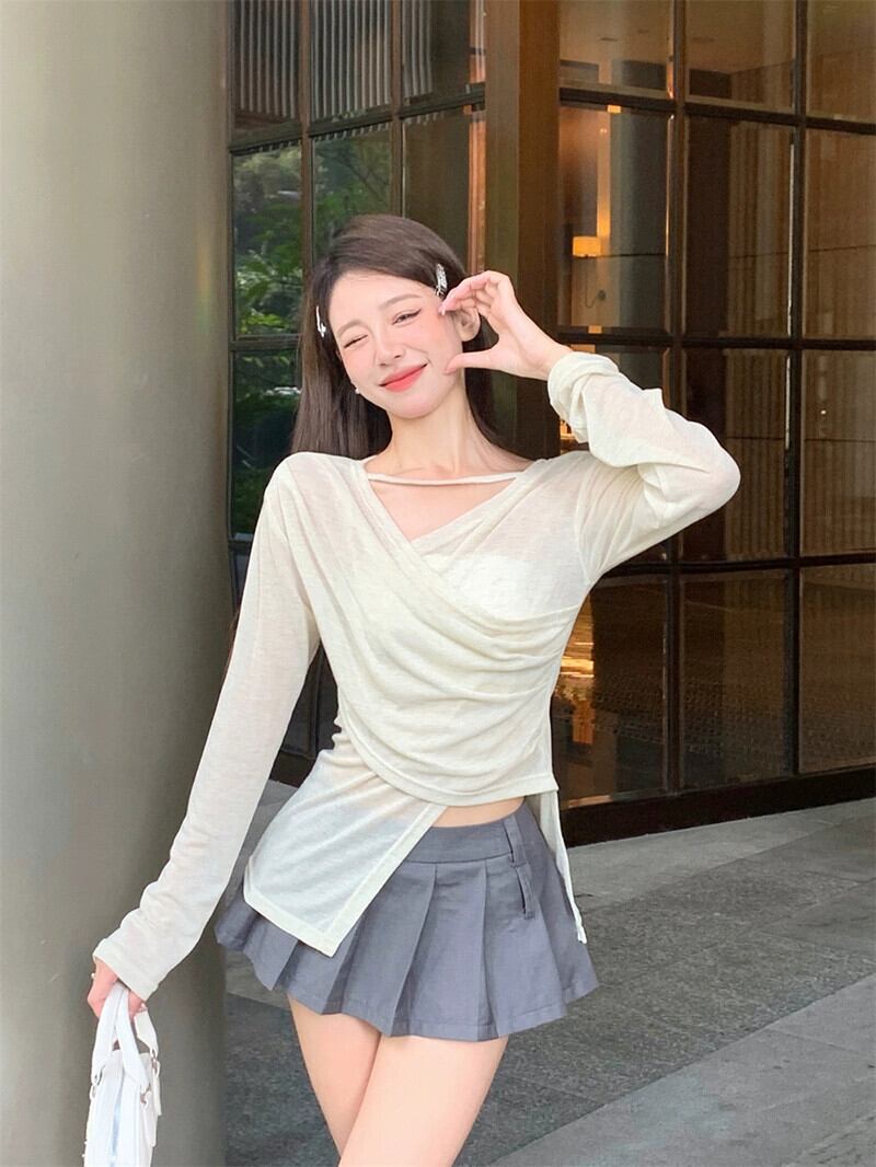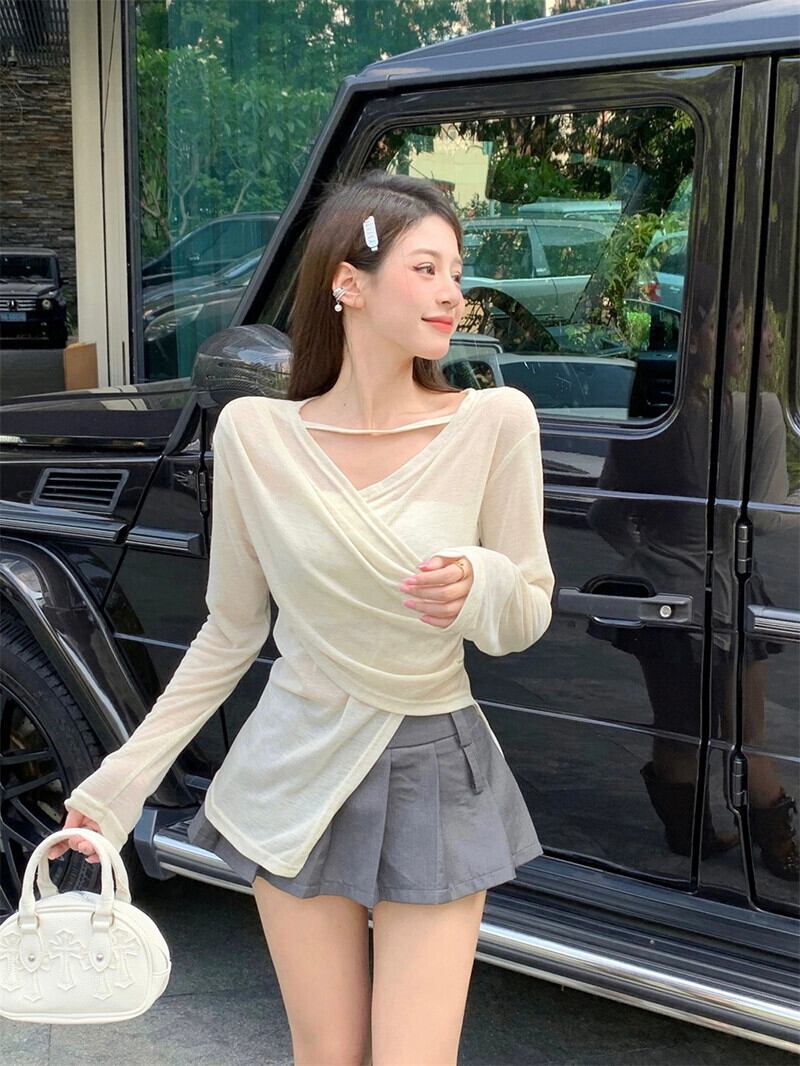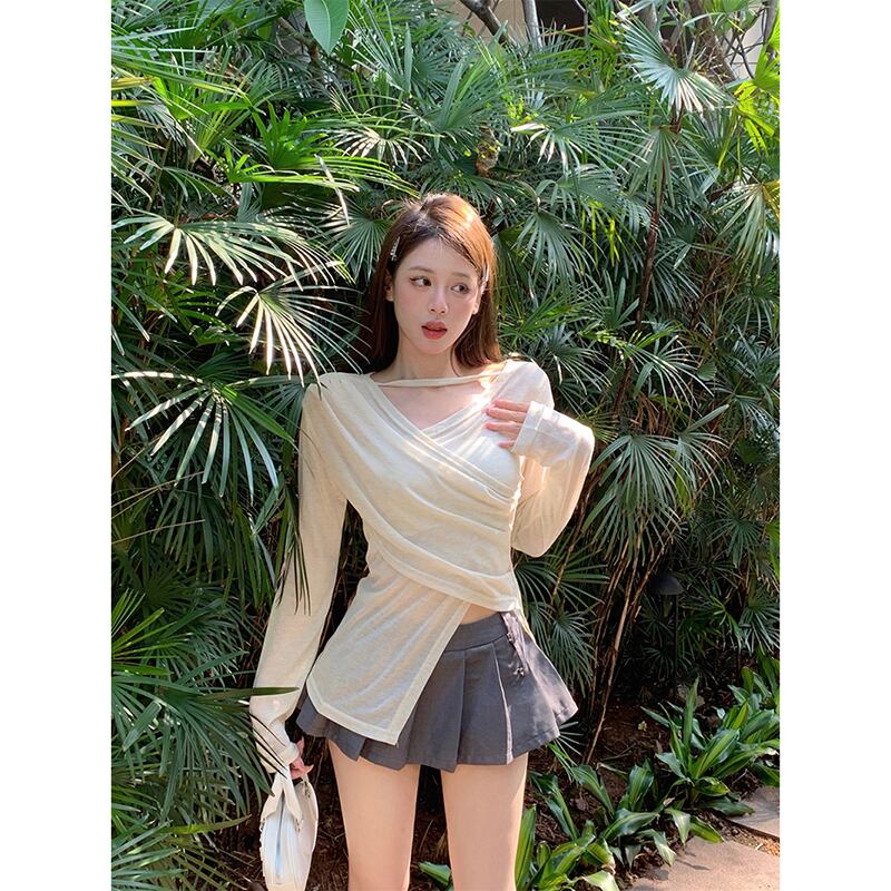 純粋な欲望の風 V ネック長袖日焼け止め T シャツレディース夏新作甘くて不規則なスリットウエストミドル丈トップ潮 ロング 大人ガーリー スウィート キュート カジュアル サマー 夏物 Vネック Tシャツ missk57039880509