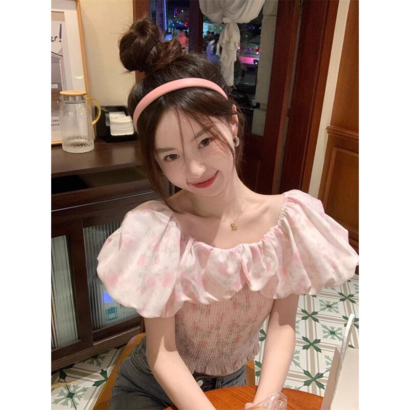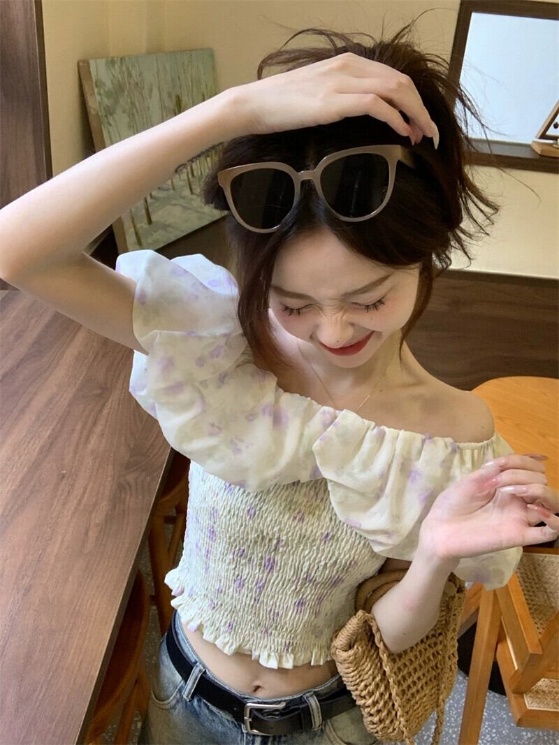 甘いフリルワンショルダー花柄半袖シャツレディース夏新作ウエストプリーツデザインショートトップ 大人ガーリー スウィート キュート カジュアル サマー 夏物 missk6922051159