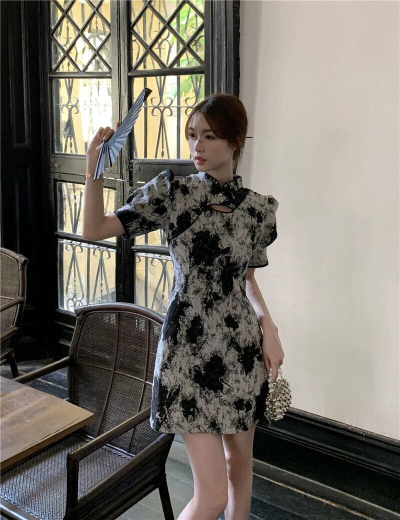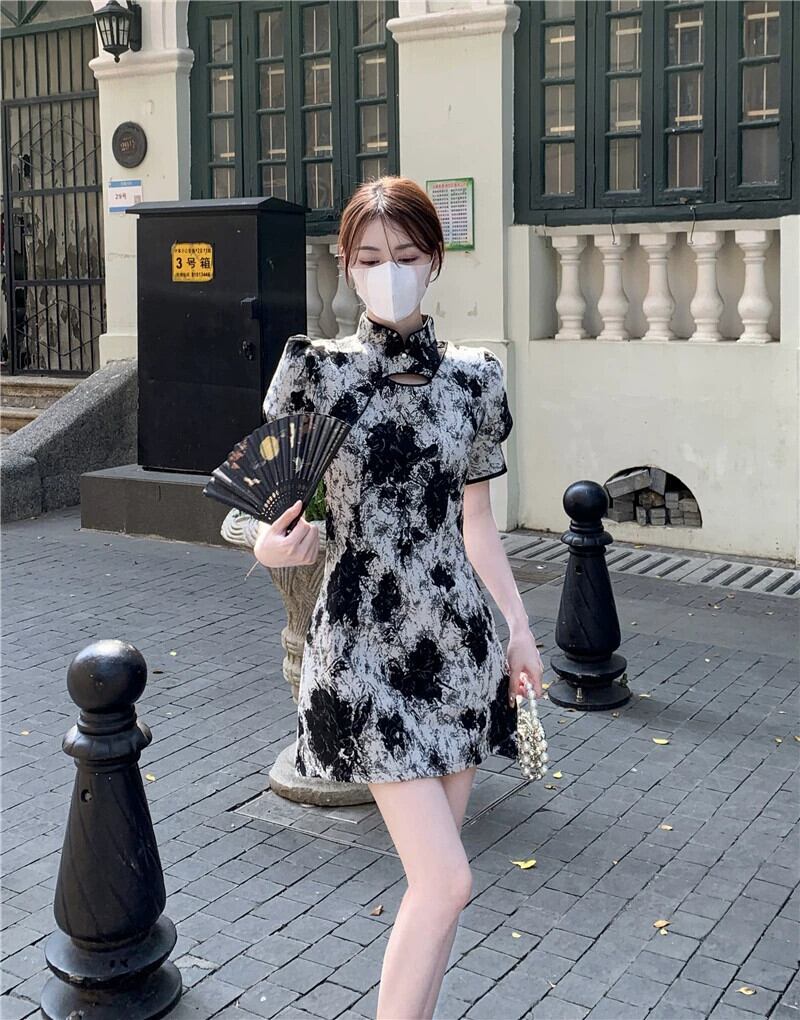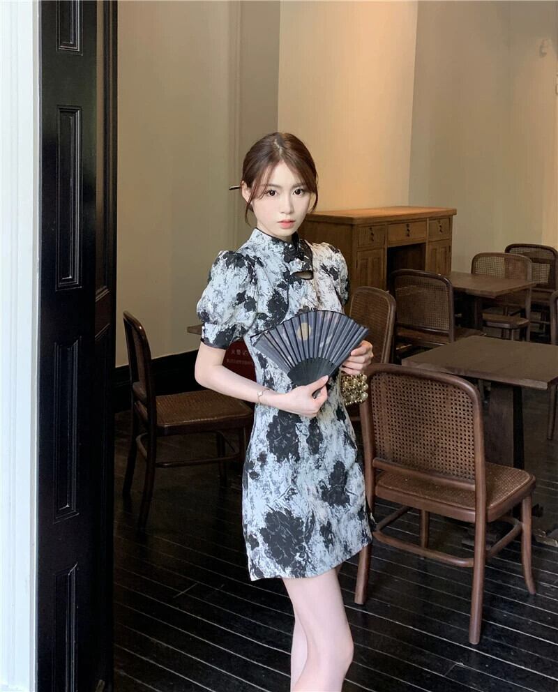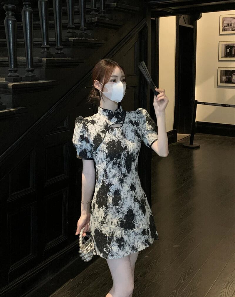 レトロな水墨画中空ドレス夏の新しいウエスト新しい中国風の改善されたチャイナパフスリーブスカート婦人服 サマー 夏物 missk49572462674