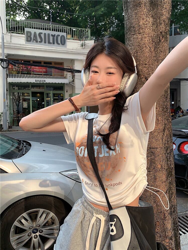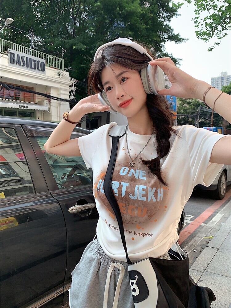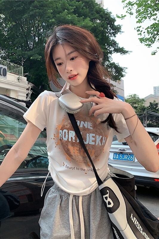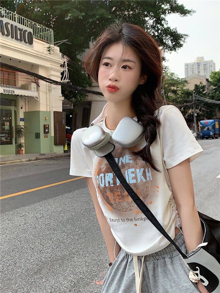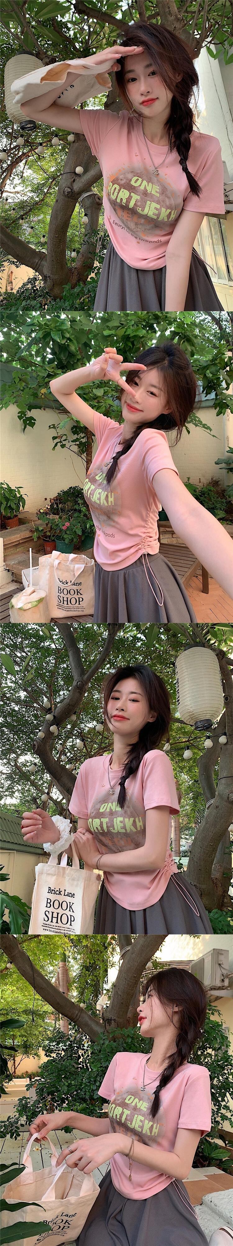 巾着レタープリント半袖Tシャツレディース夏新作甘いスリムショートセクションオールマッチ策略ショルダートップ 大人ガーリー スウィート キュート カジュアル サマー 夏物 missk81716633405