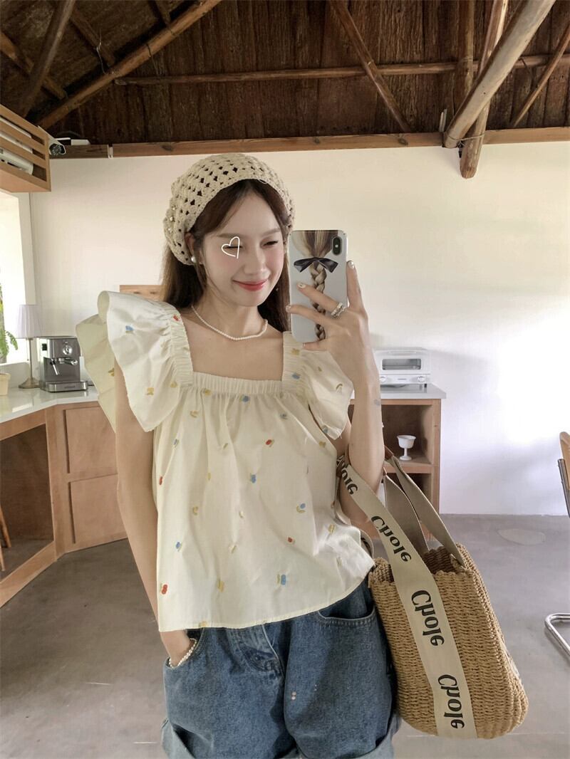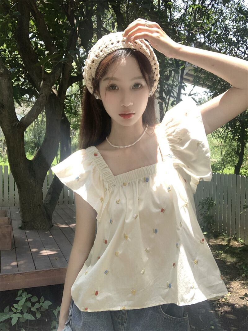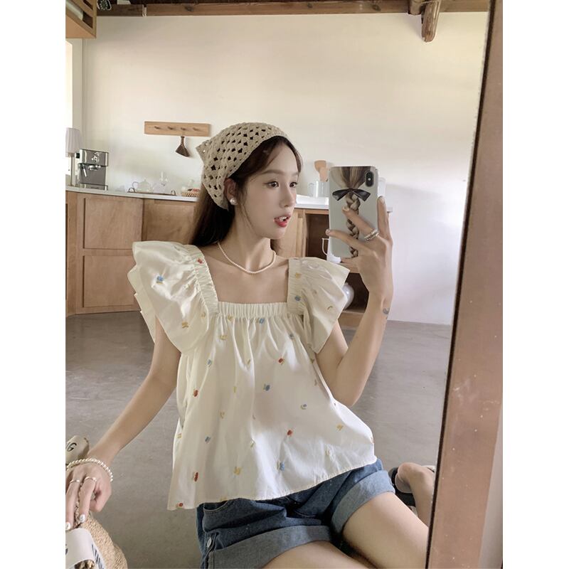 フレンチスタイルの小さなフライングスリーブシャツ女性の夏の新しいレトロな自己修養スクエアカラーデザインセンスニッチショートシックトップトレンド サマー 夏物 スクウェア missk50898499644