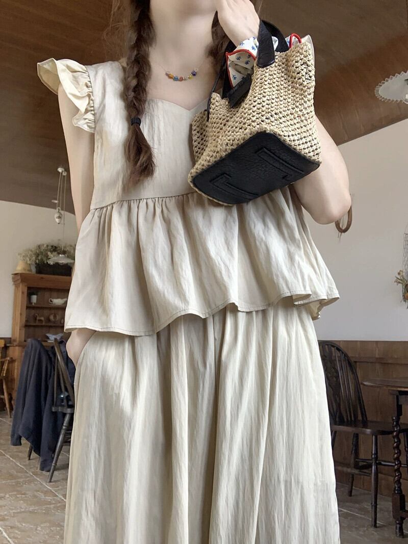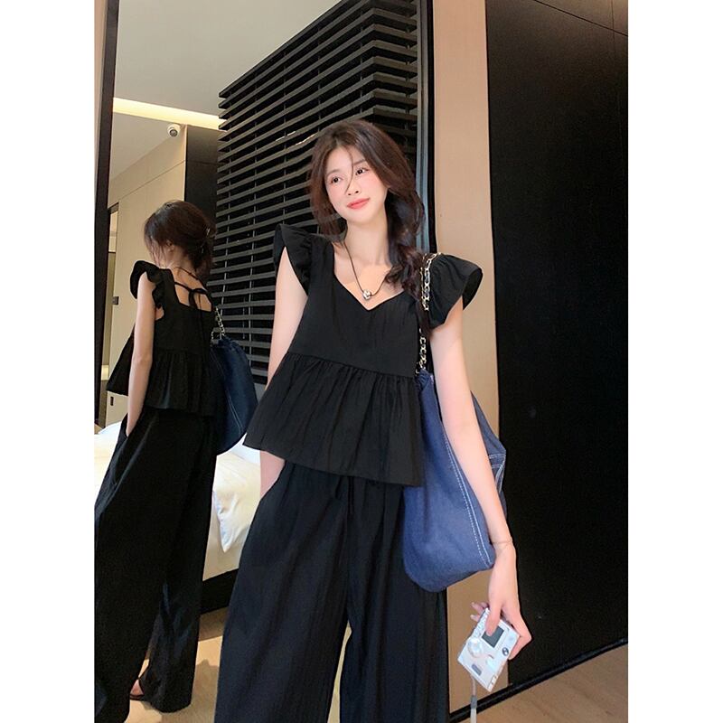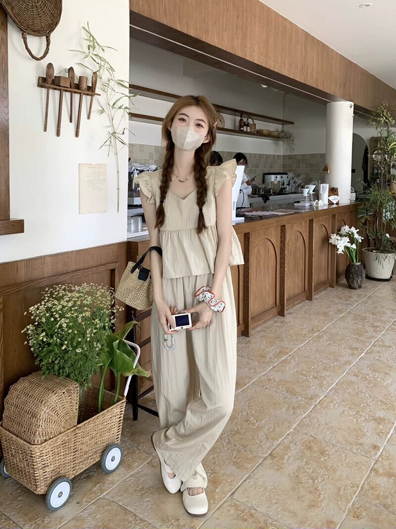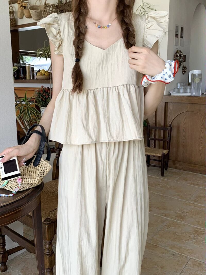 小さな飛行袖付きソルトウェアショートドールシャツトップハイウエストカジュアルワイドレッグパンツ女性の夏の新しいファッションスーツ ハイウェスト サマー 夏物 ワイドパンツ missk21761169103