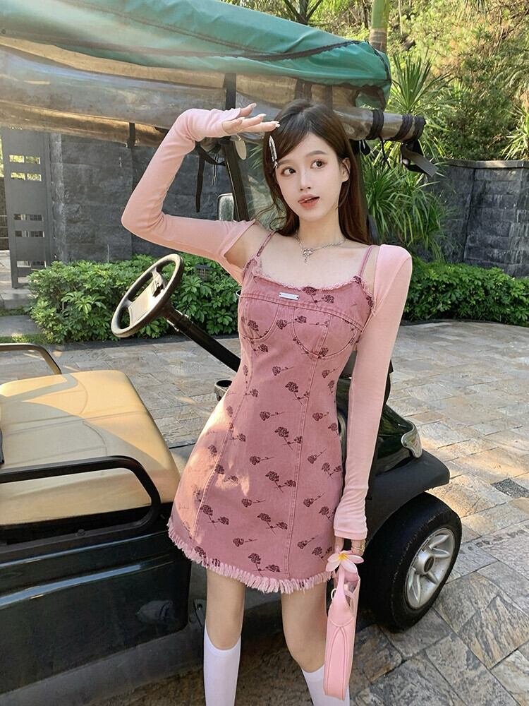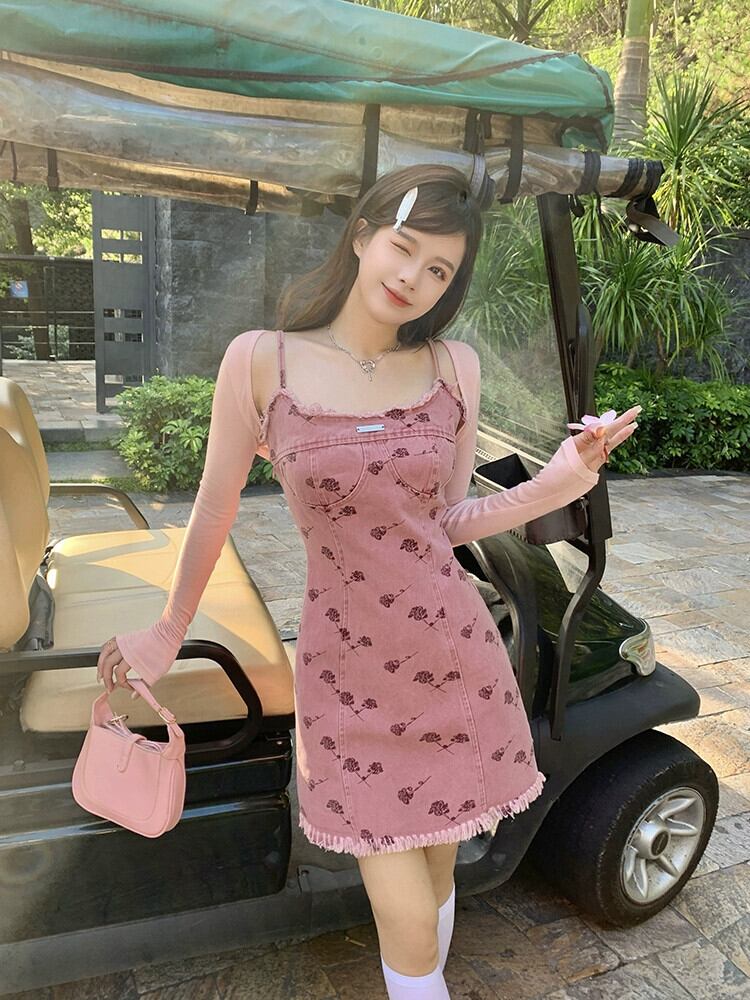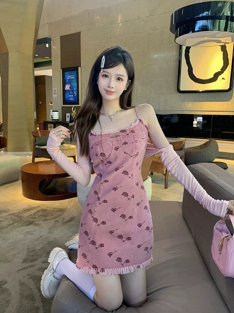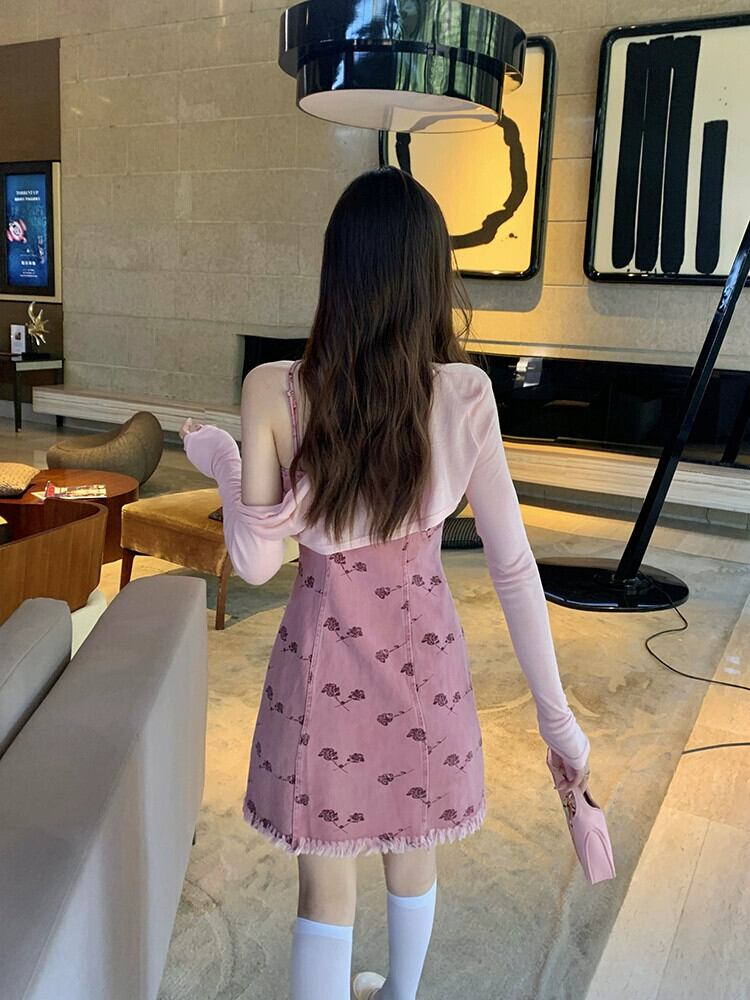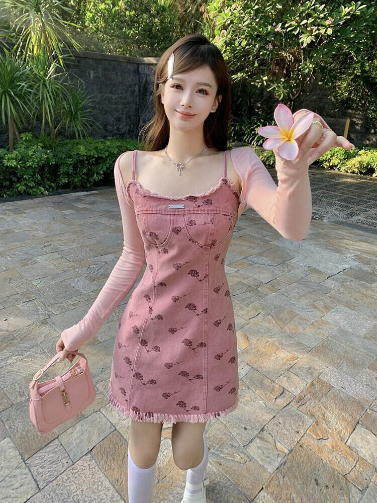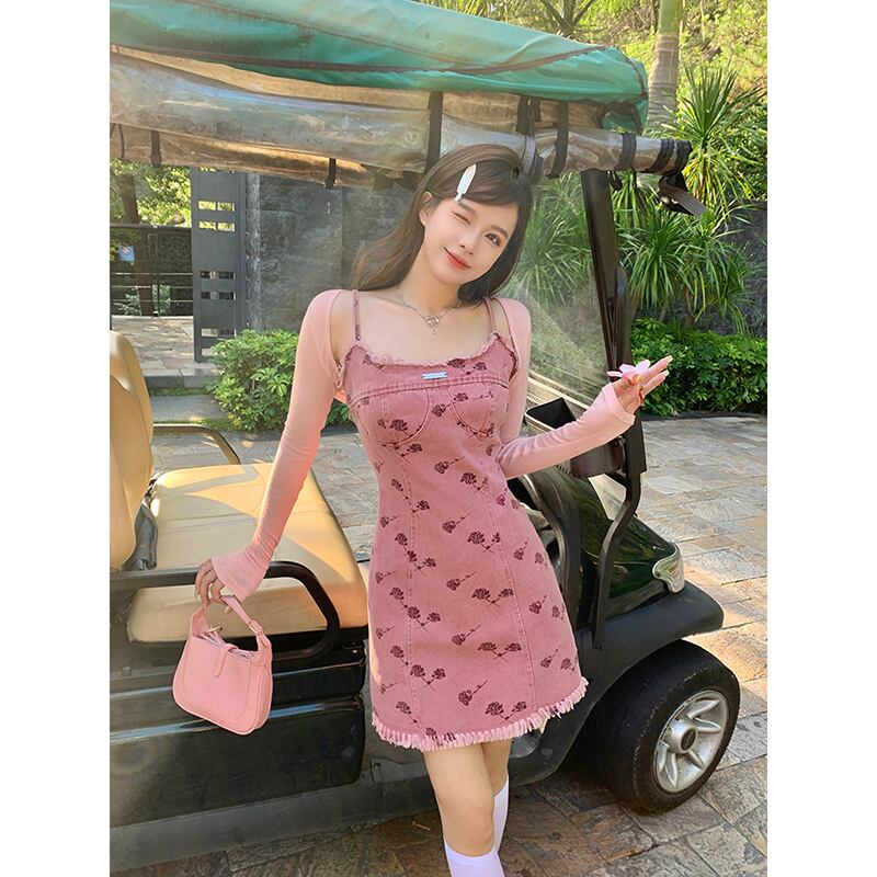 ドーパミンはデニムサスペンダードレスを着ています夏フレンチウエストピンクの花柄Aラインスカート女性潮 サマー 夏物 missk61851151554