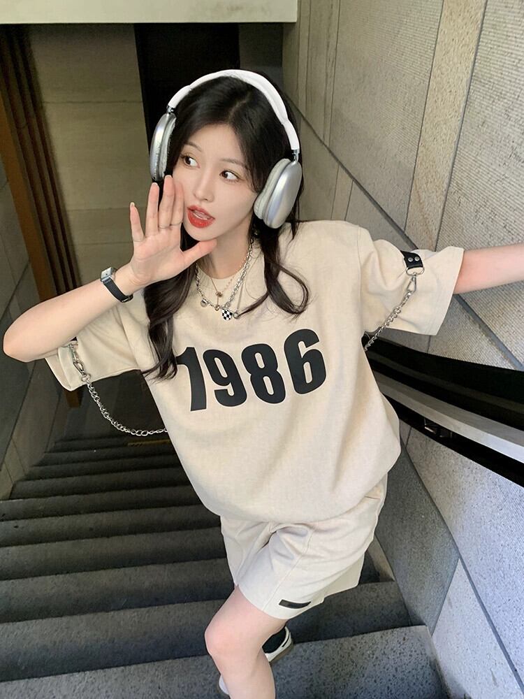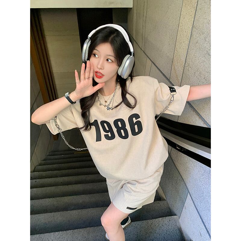 スポーツスタイルカジュアルスーツレディースルーズプリント半袖Tシャツハイウエストカジュアルショートパンツ夏の新作2点セットトレンド ハイウェスト サマー 夏物 ショーツ ブルマー missk46898961052