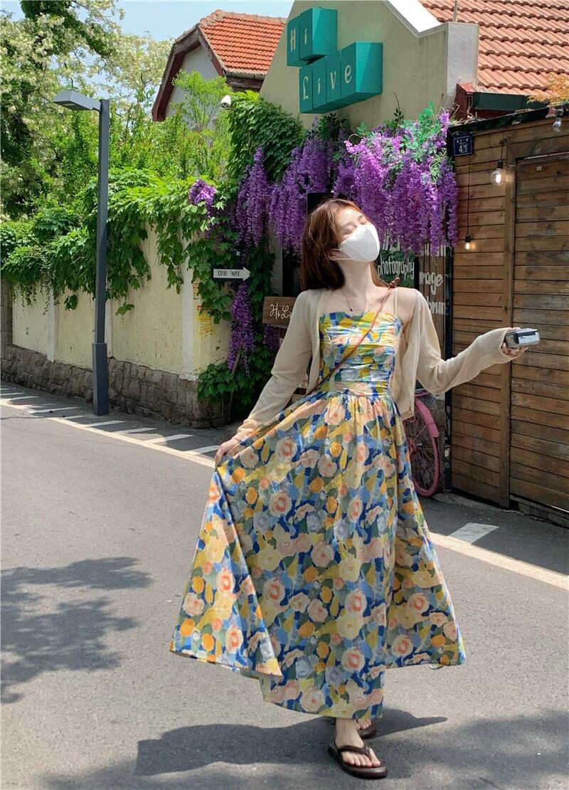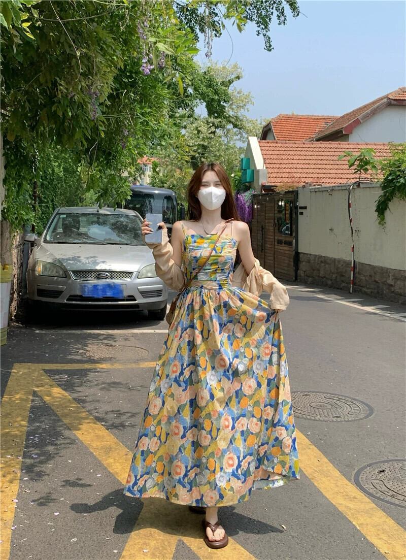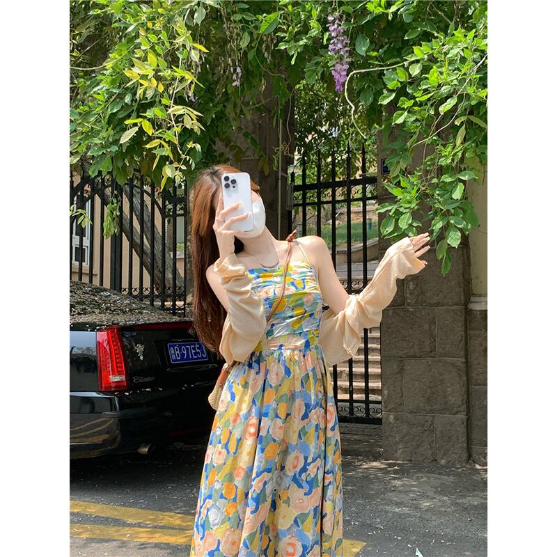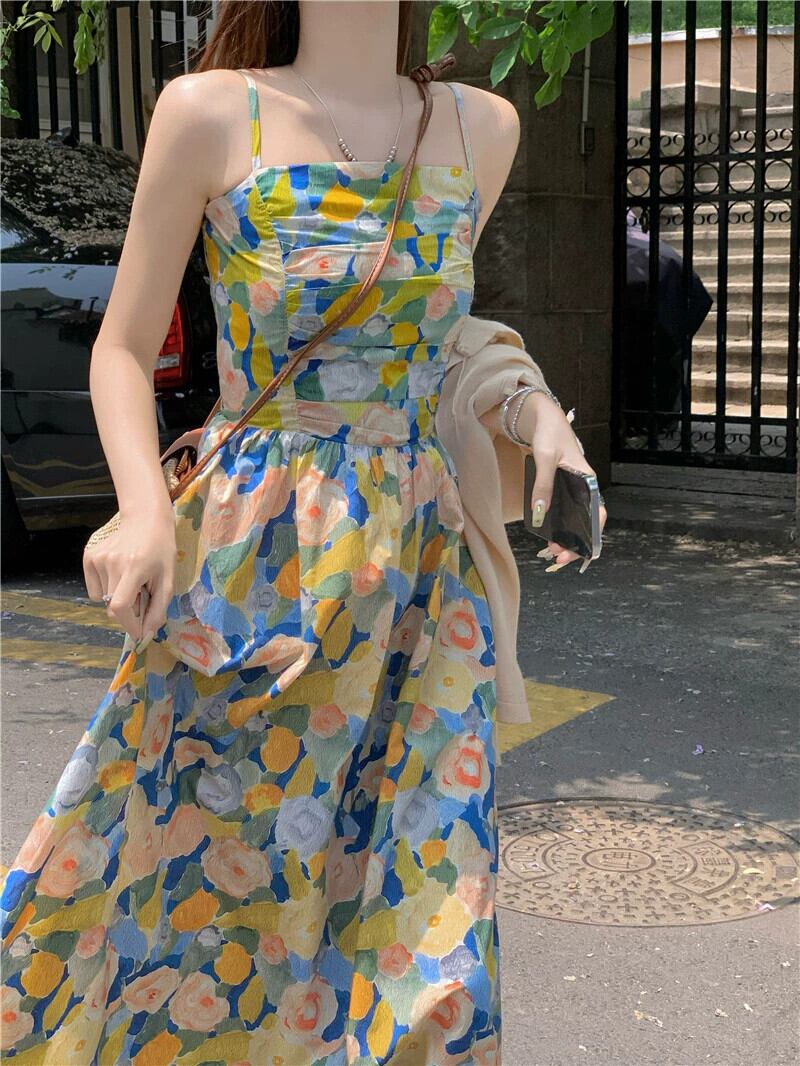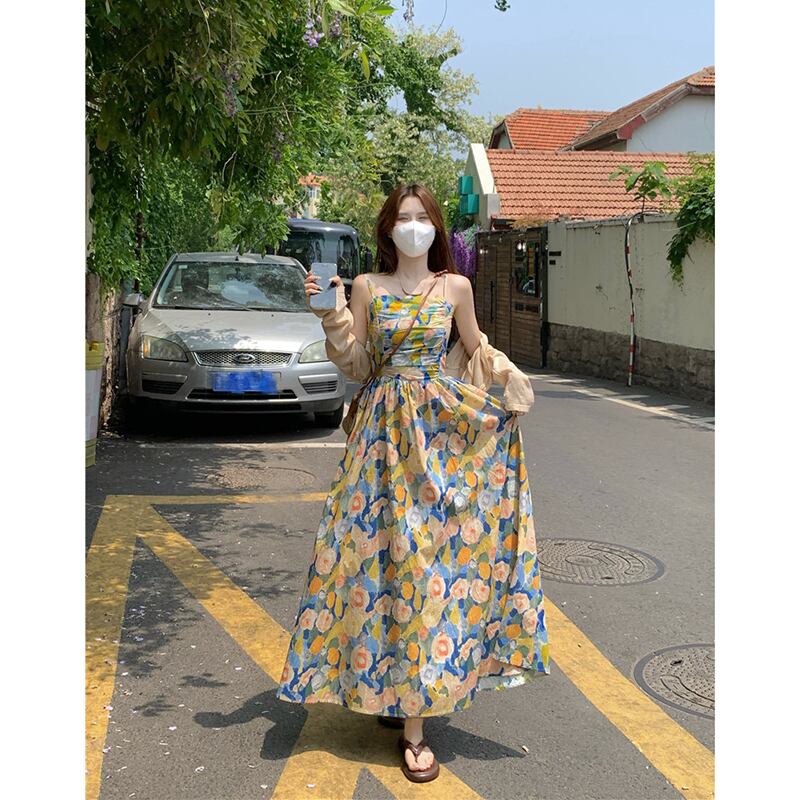 ホリデースタイル花柄スリングドレス女性の夏の新しいフレンチウエストデザインセンスシーサイドビーチミッドレングススカート サマー 夏物 missk74128436374