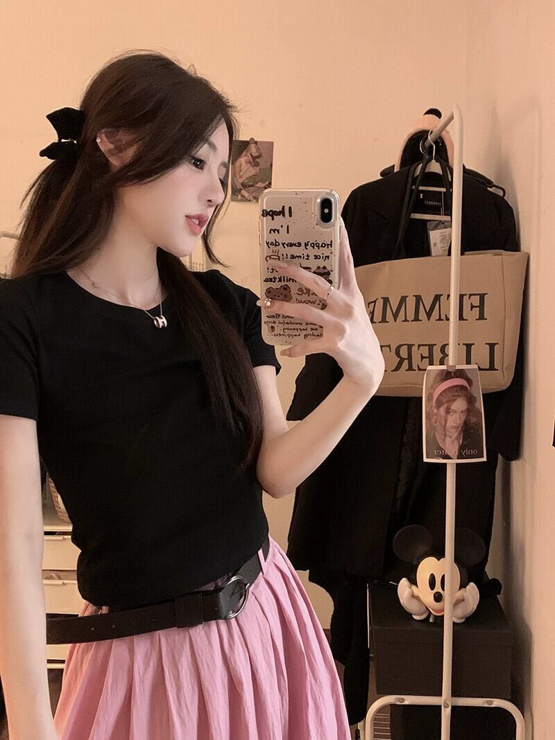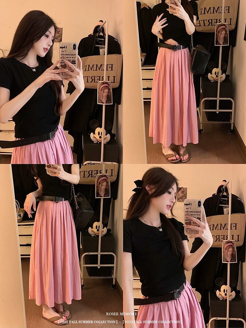色:黒いTシャツ,ピンクのスカート,ベルト