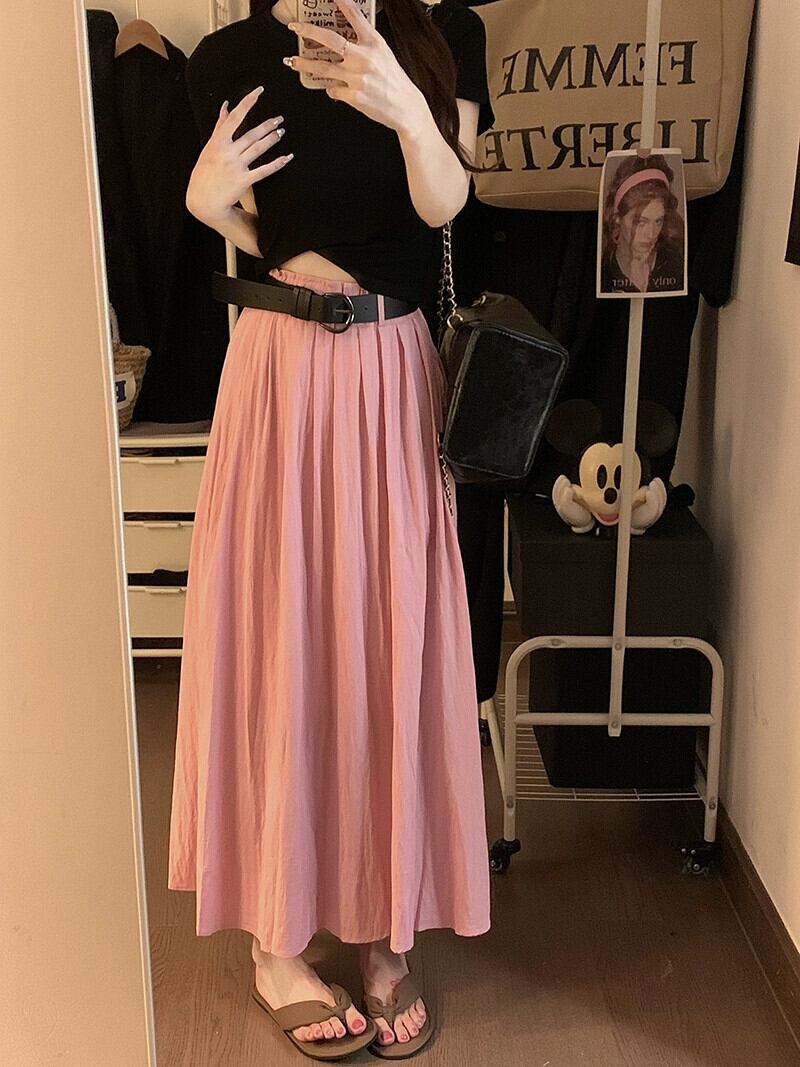 -エンドピンクスカートレディース夏新作フレンチレトロハイウエスト痩身デザインプリーツ気質ロングスカート ハイウェスト サマー 夏物 missk37890628237