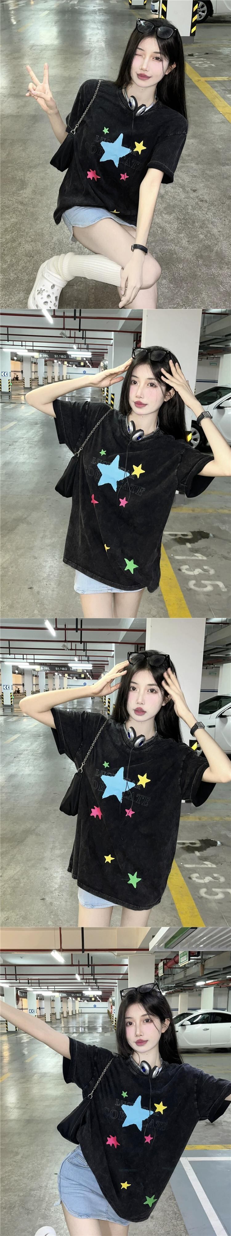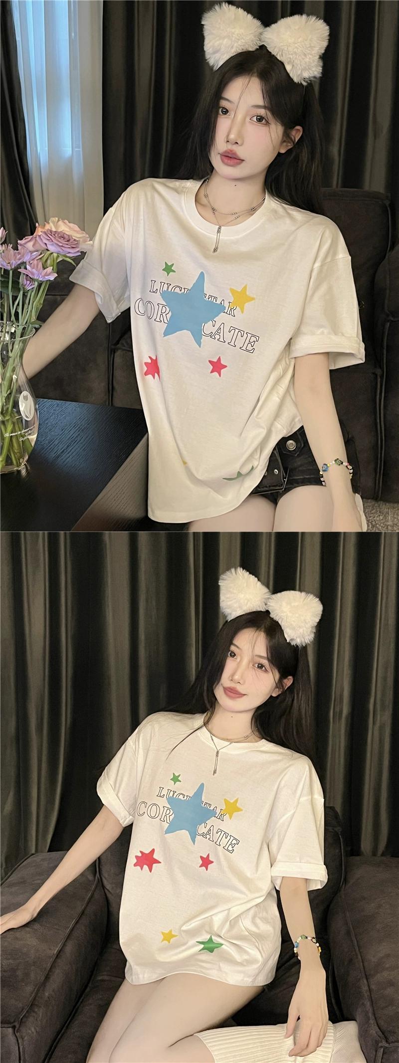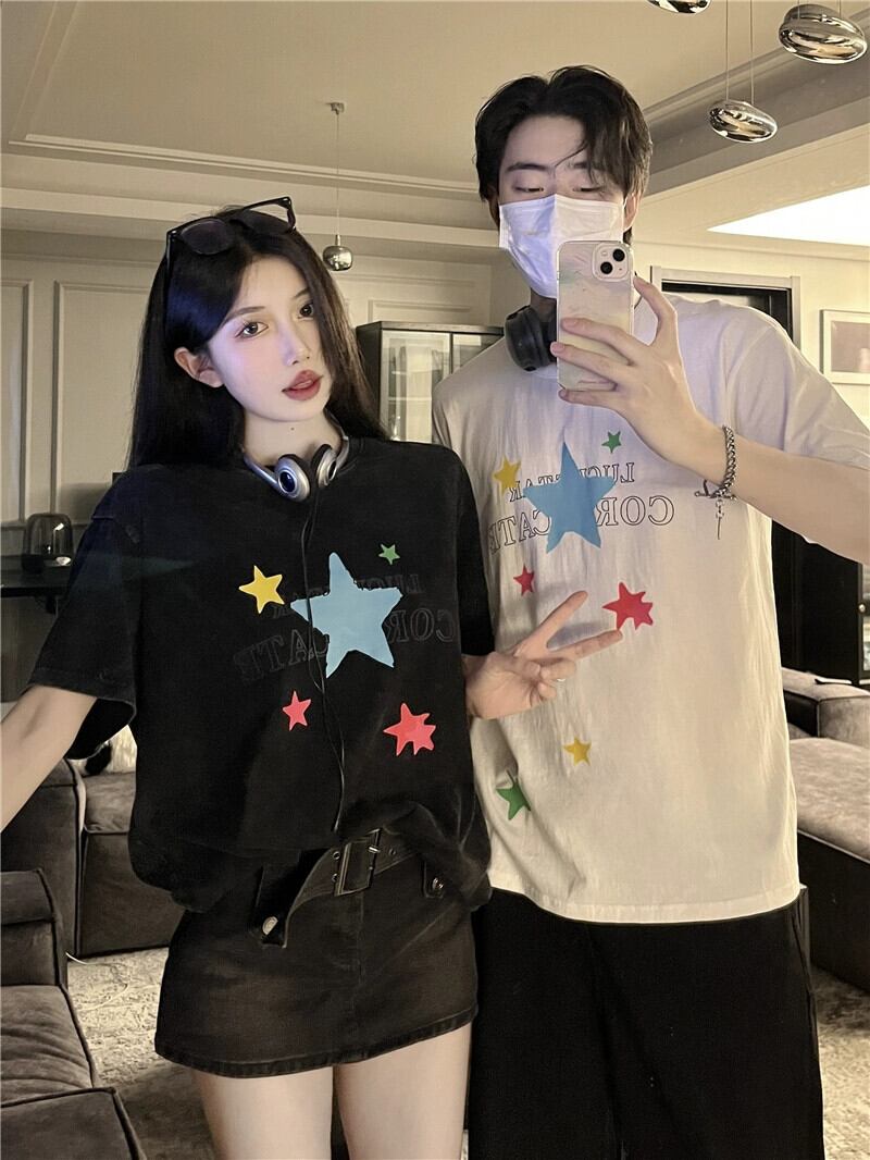 スターレタープリント Tシャツ女性の夏の新しい甘くてクールな私室ハニーカップルモデルルーズデザイン半袖トップ潮 大人ガーリー スウィート キュート カジュアル サマー 夏物 missk12032296242