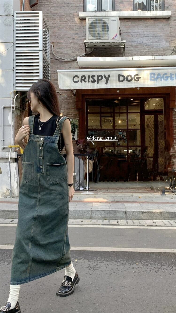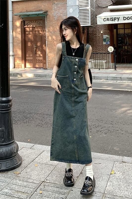 シングルブレストデニムストラップドレスレディース 2023 年夏新しいレトロウォッシュミッドレングス痩身と年齢を減らすスカート サマー 夏物 missk60289125369