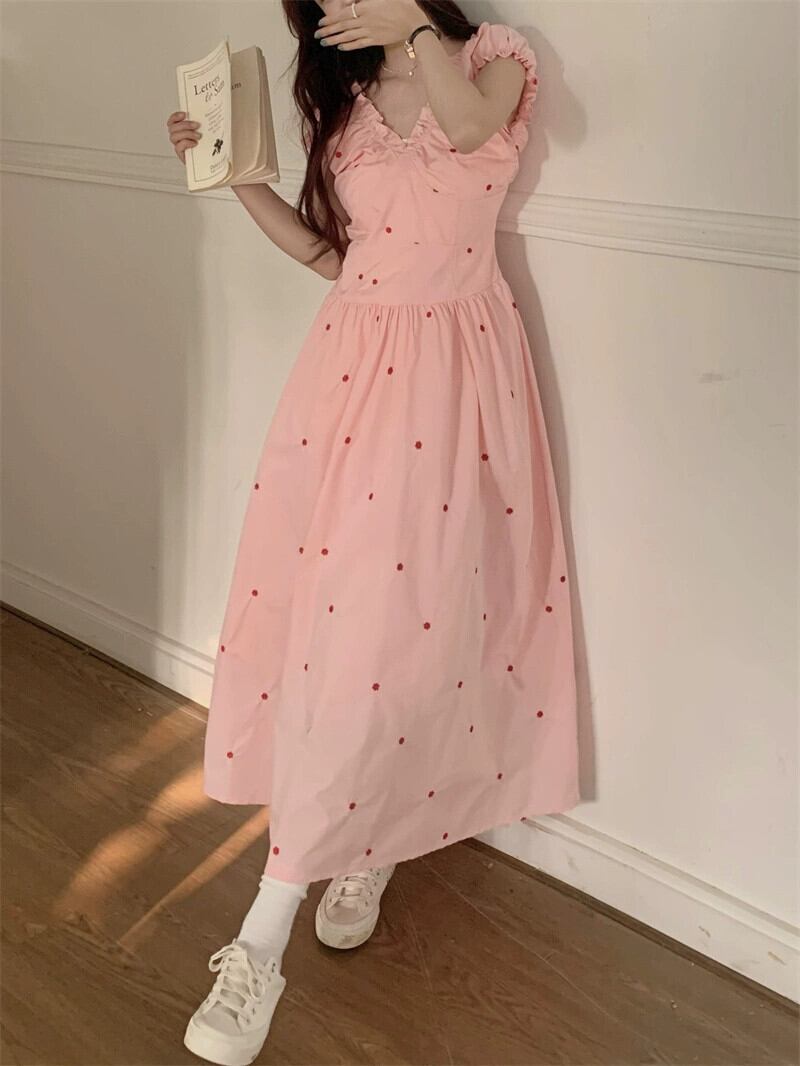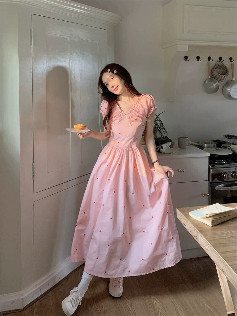 V ネックプリーツパフスリーブドレス女性の夏の 2023 新しい甘いウエスト痩身ミッドレングス半袖スカート 大人ガーリー スウィート キュート カジュアル サマー 夏物 Vネック missk44167718367
