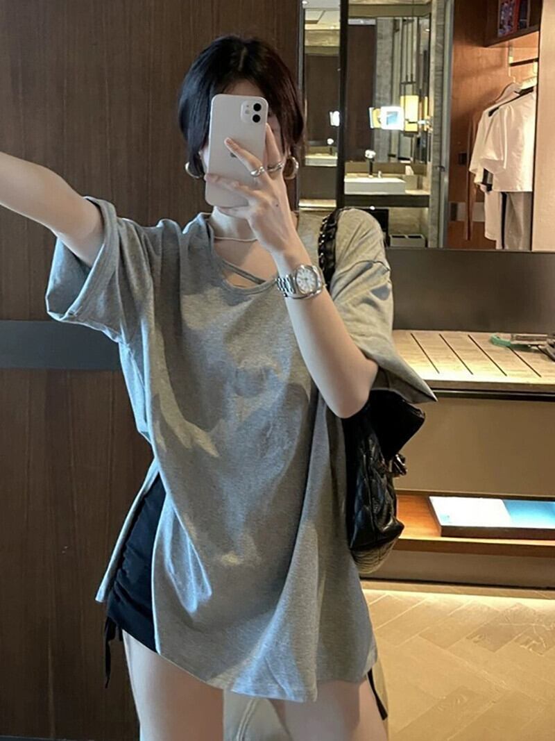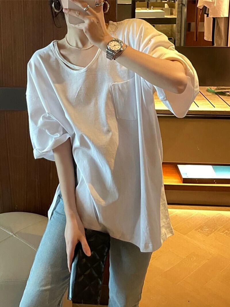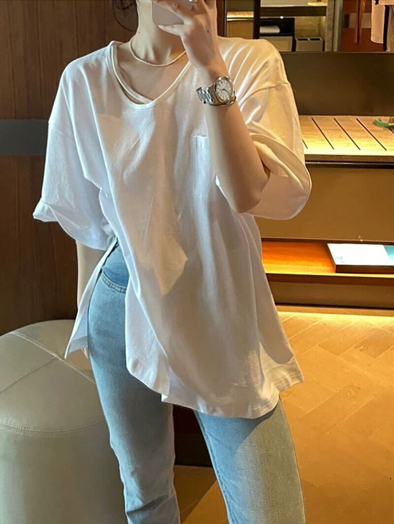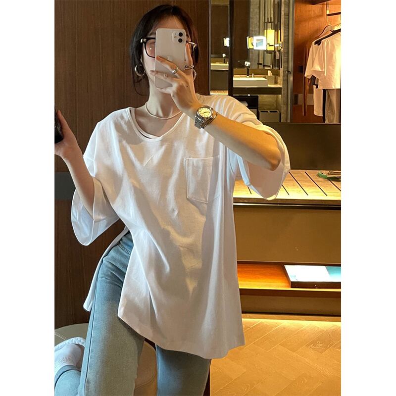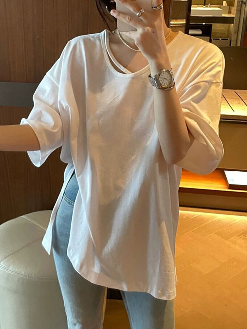 Uネック Tシャツ レディース デザインセンス 2023年夏 新スタイル 五分袖 ゆったり ミドル丈 スリット 五分袖トップス サマー 夏物 missk63173732058
