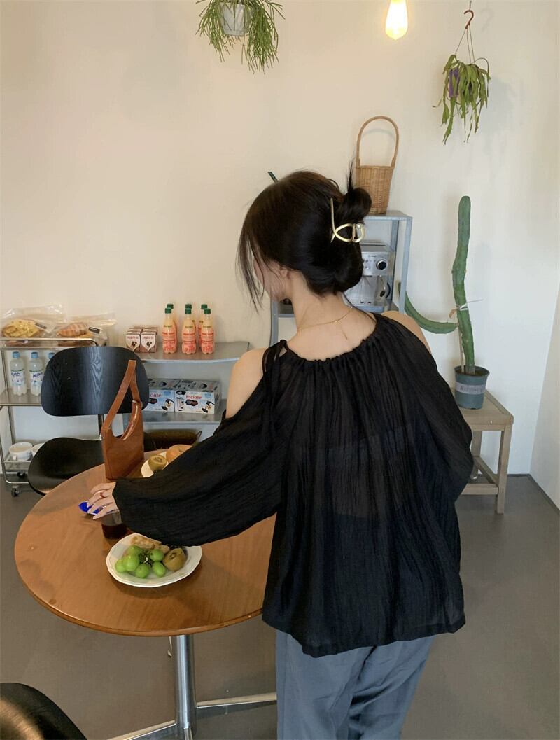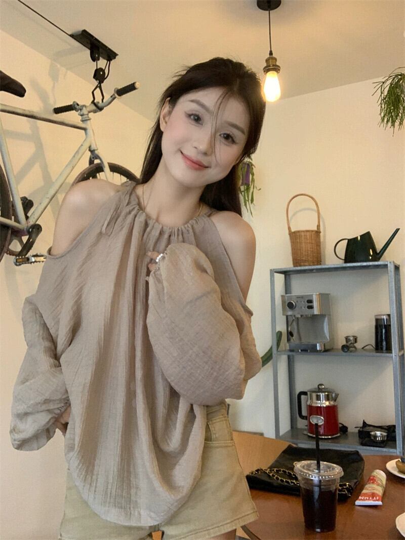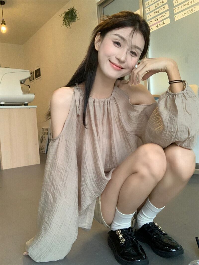 2023 夏の新フレンチスタイルの穏やかな風注意マシンストラップレスネクタイデザインルーズ無地長袖シャツ女性 ロング サマー 夏物 ソリッドカラー missk32199570787