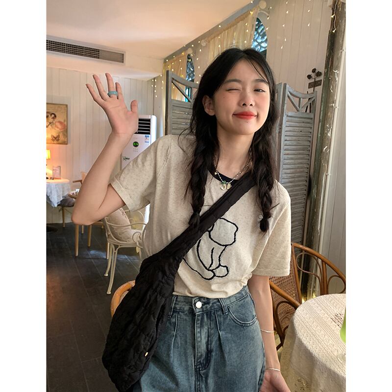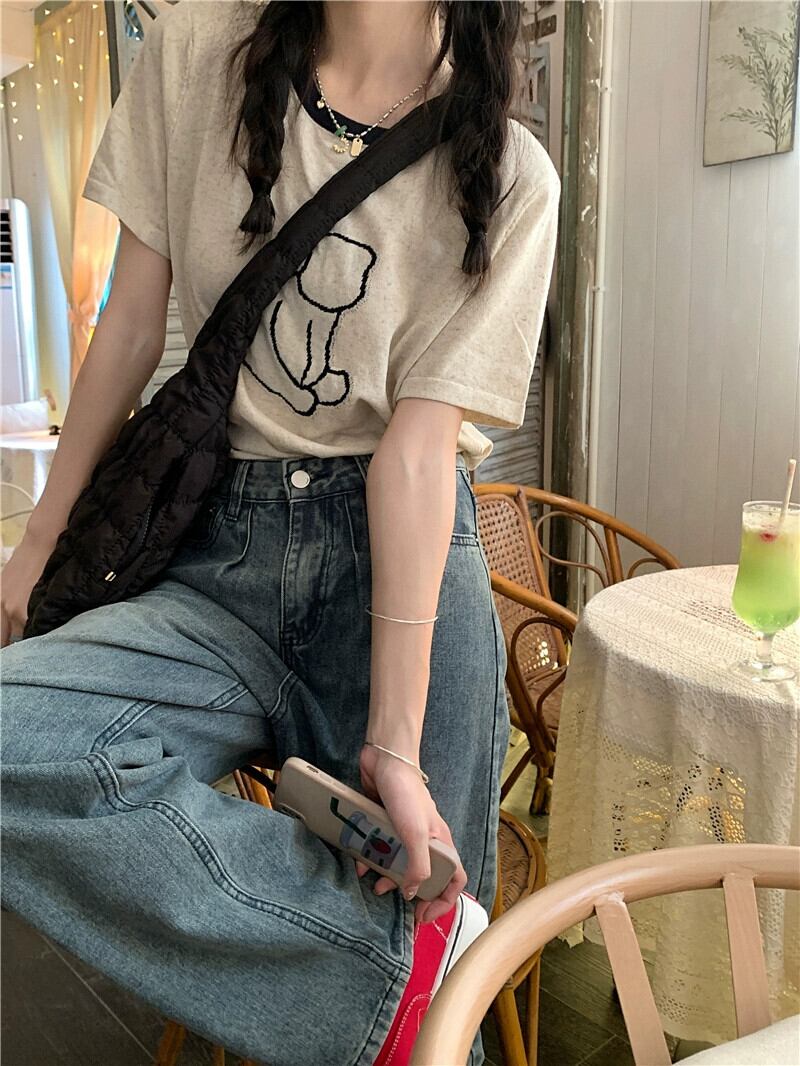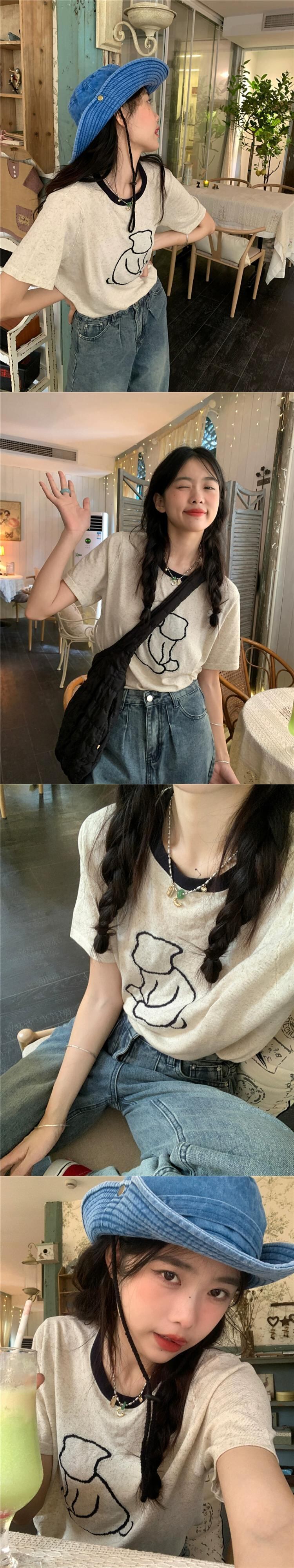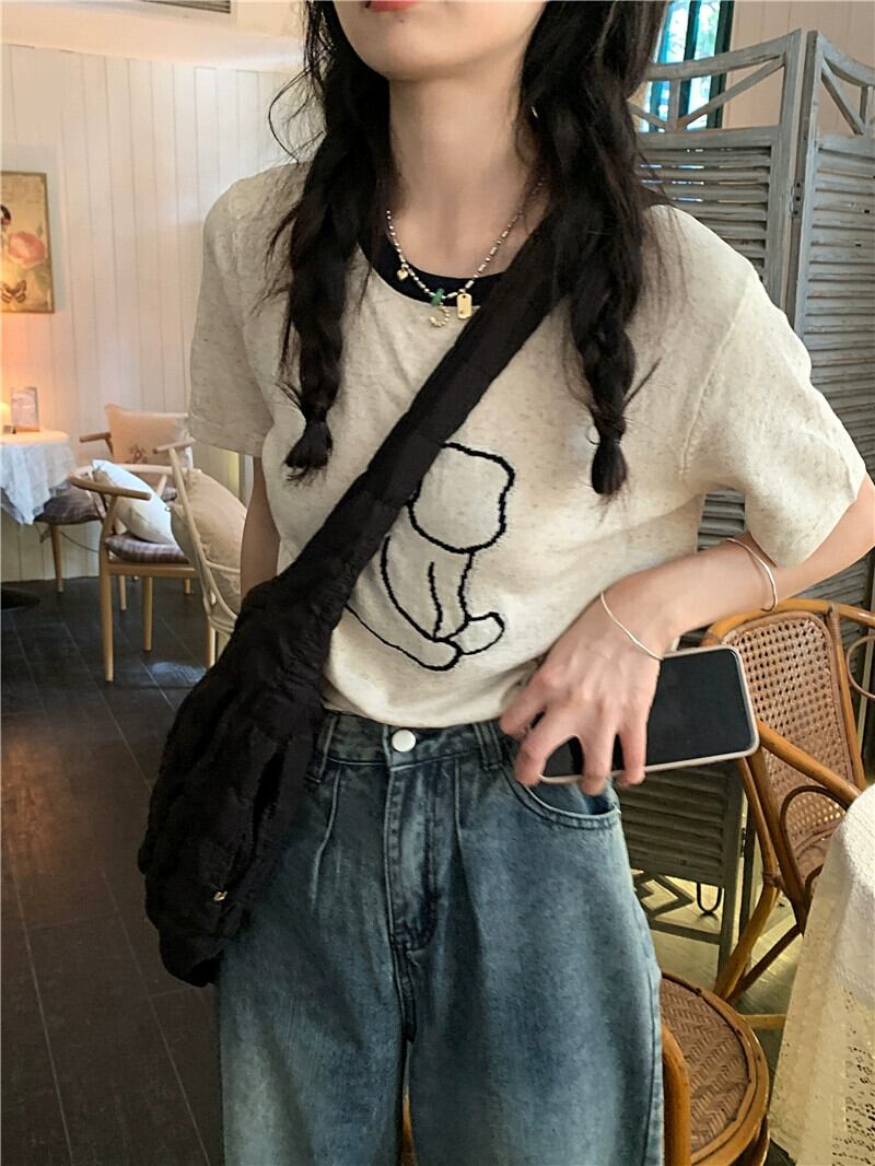コントラストカラーラウンドネックショルダー Tシャツ女性の夏の 2023 新しい漫画プリントルーズ半袖ニットトップイン サマー 夏物 Oネック missk83785250433
