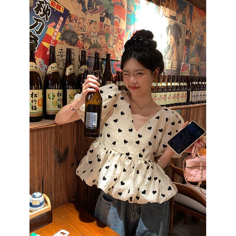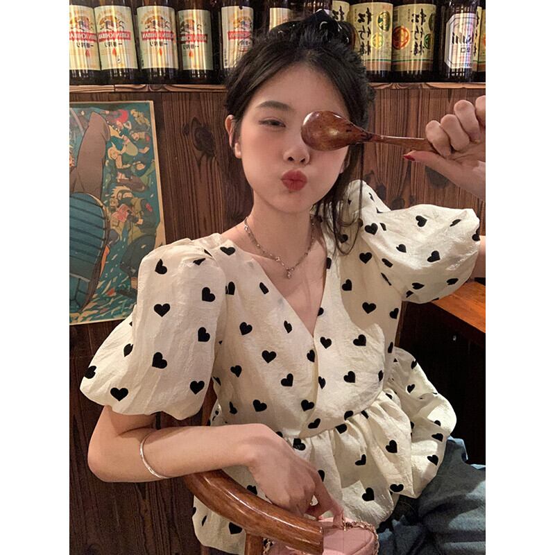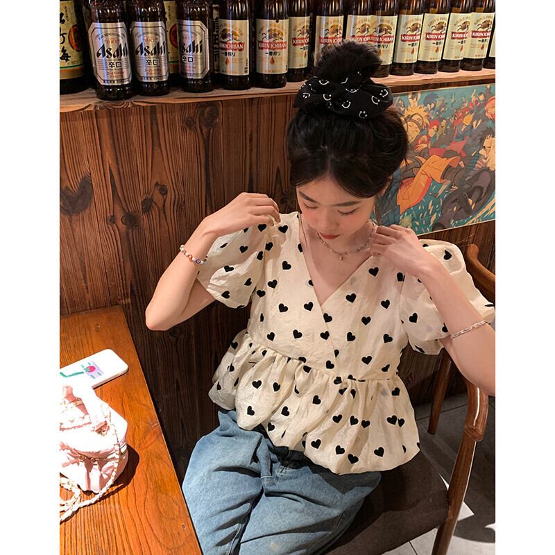 愛花柄パフスリーブシャツレディース2023年夏新作フレンチレトロVネックスリムふわふわ半袖トップ サマー 夏物 missk42793976972