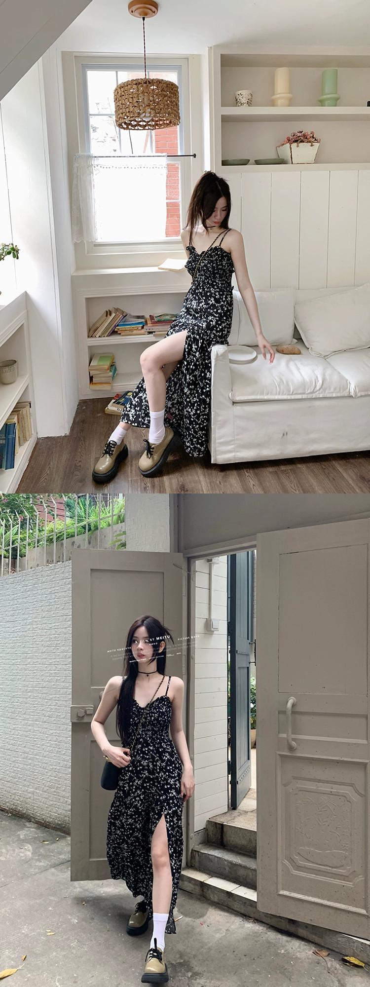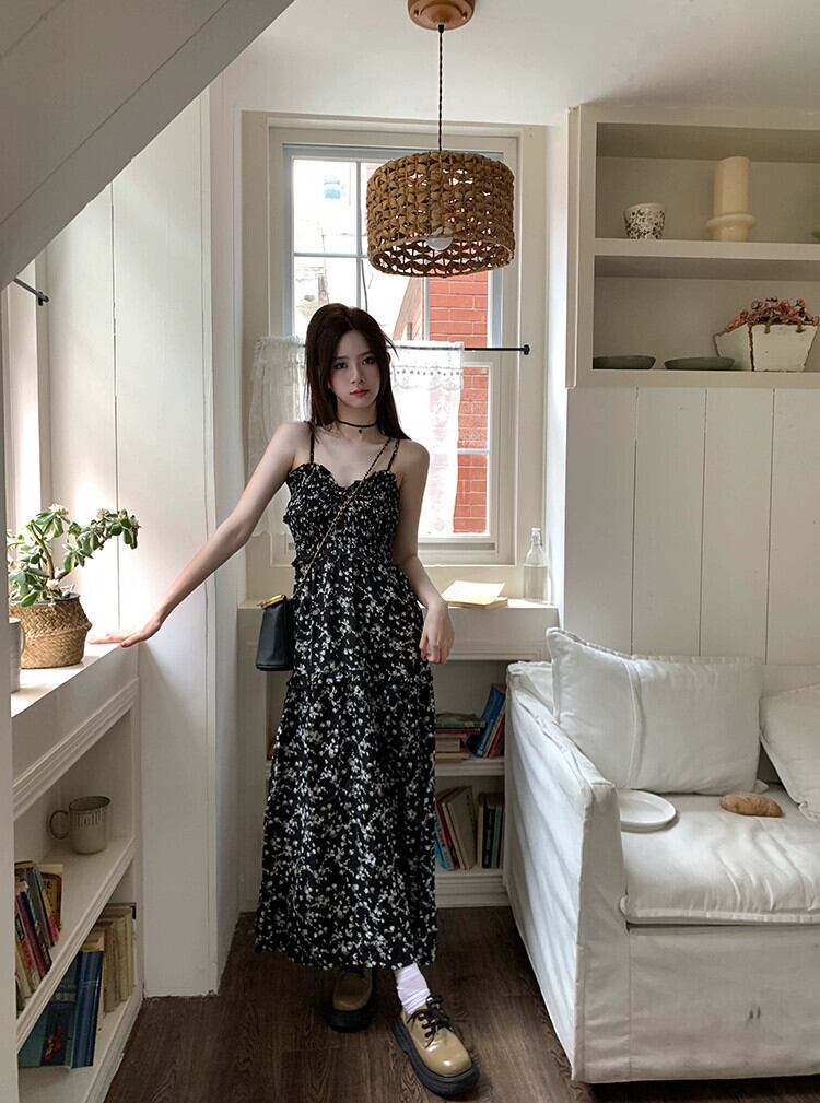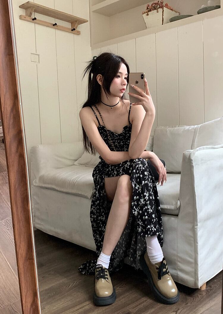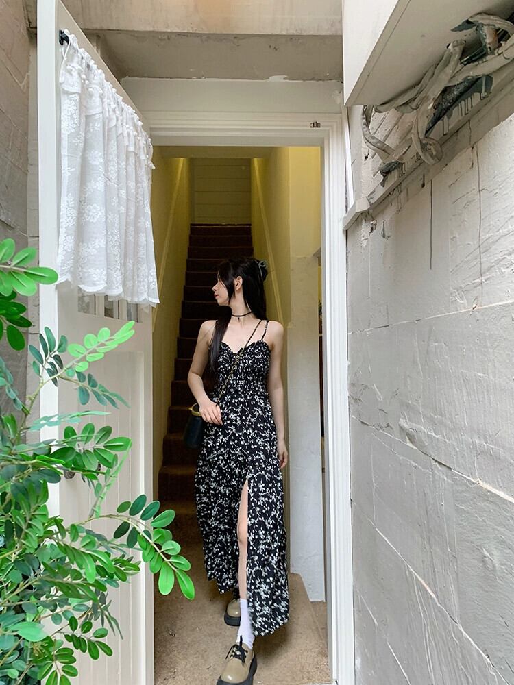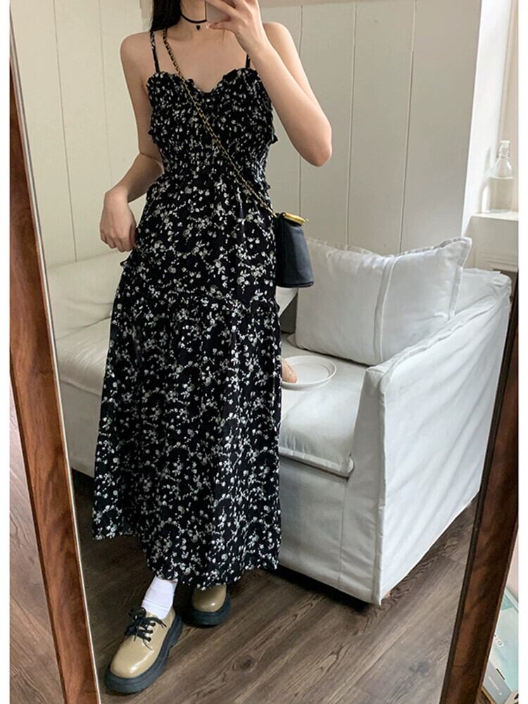 黒花柄スリングドレスレディース 2023 夏の新作インスリットミッドレングスウエストフレンチロングスカート ブラック サマー 夏物 missk32574205454