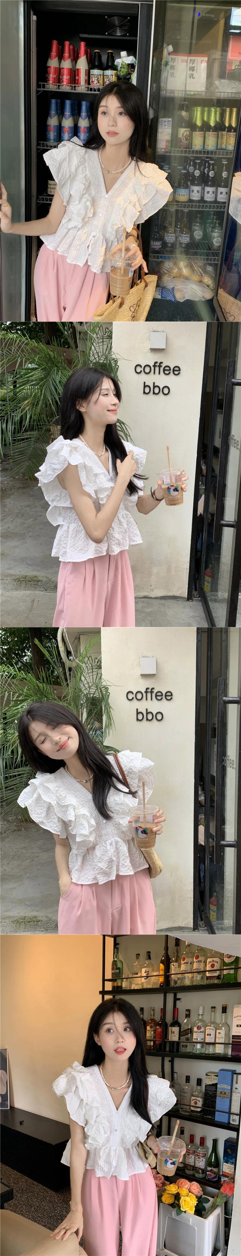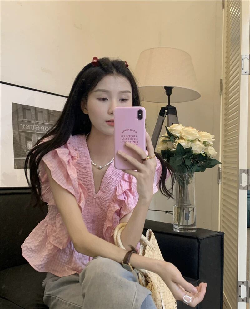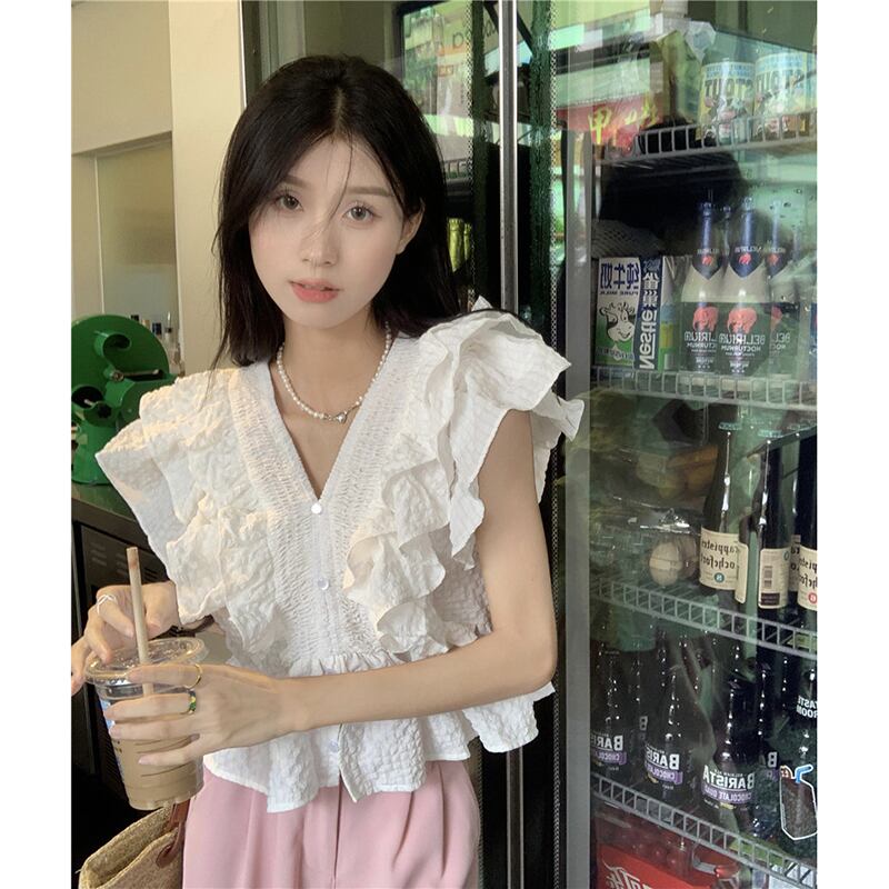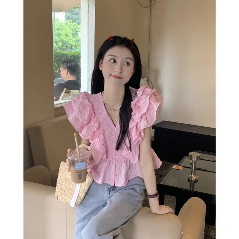 夏スタイル 2023 新しい eign スタイル年齢を軽減フリルデザインセンス V ネックフライングスリーブショートルーズシャツ女性 サマー 夏物 Vネック missk11109931518