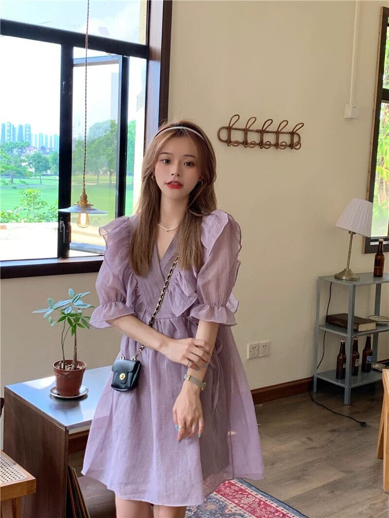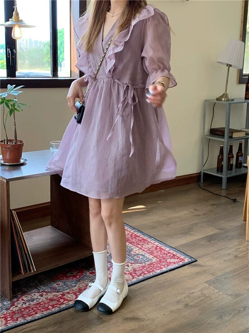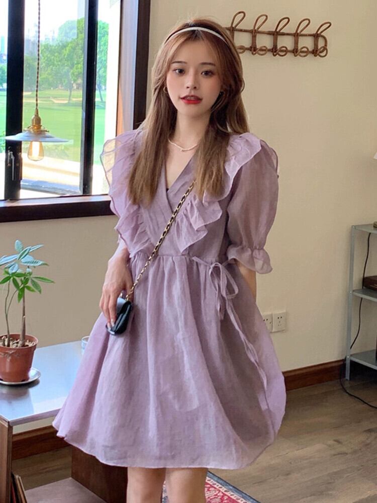 2023 夏の新ソリッドカラー優しい紫オーガンザかわいい菌サイドウエスト痩身半袖ドレス女性 大人ガーリー スウィート キュート カジュアル サマー 夏物 パープル missk40297136092