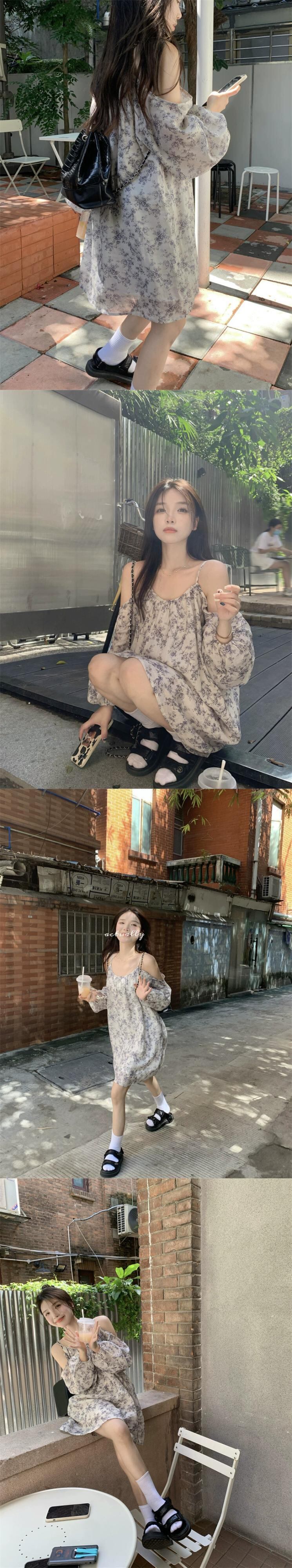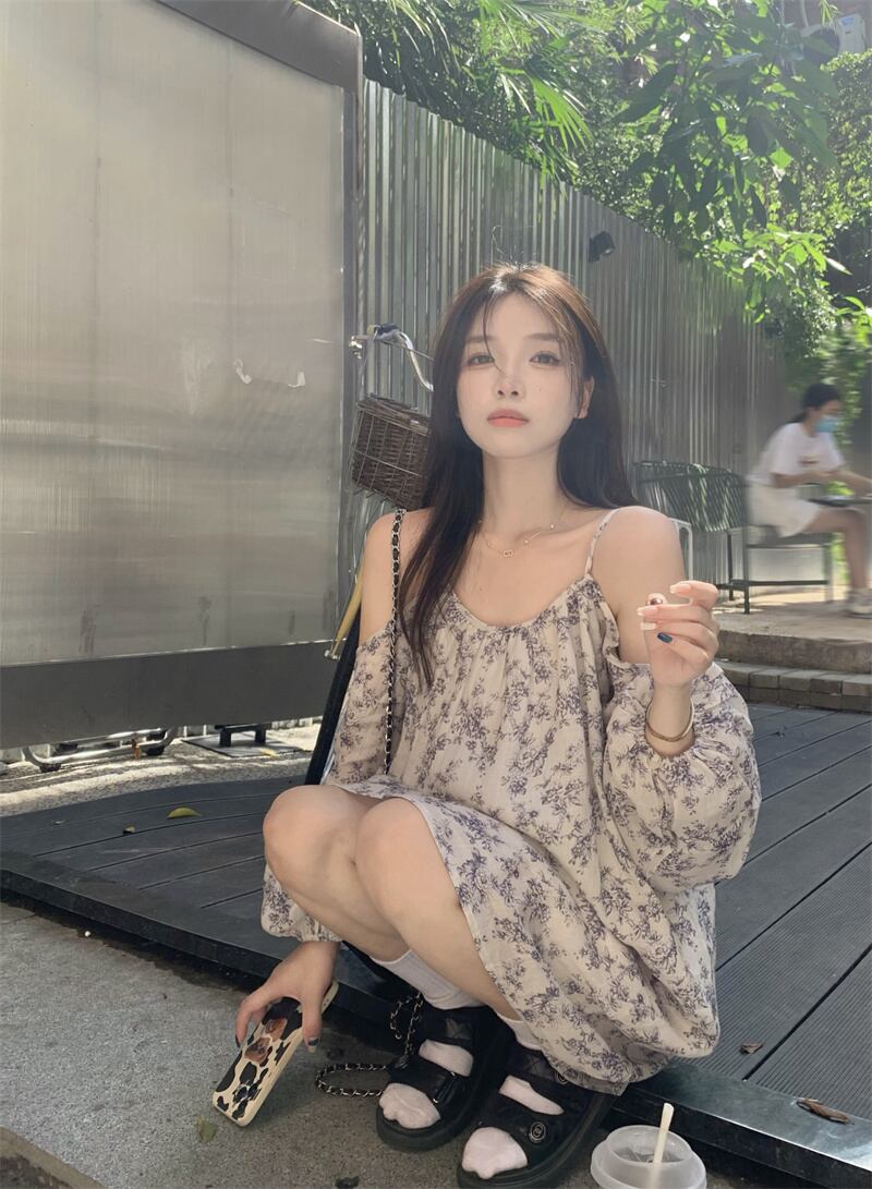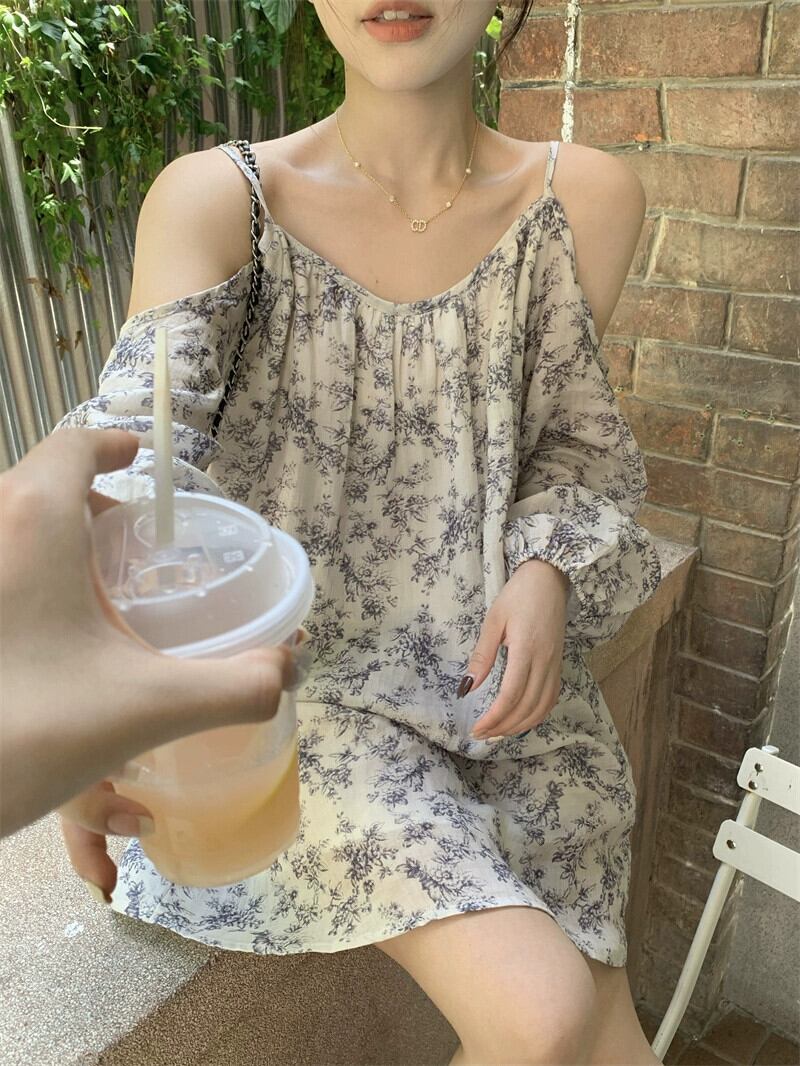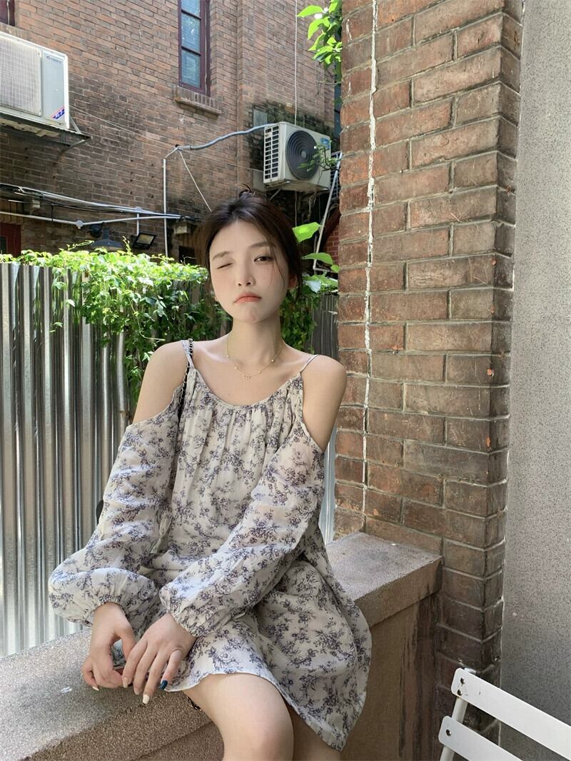 甘い花柄オフショルダー長袖ドレスレディース 2023 夏の新しいオフショルダーデザインルーズパフスリーブスカート ロング 大人ガーリー スウィート キュート カジュアル サマー 夏物 missk88677754932