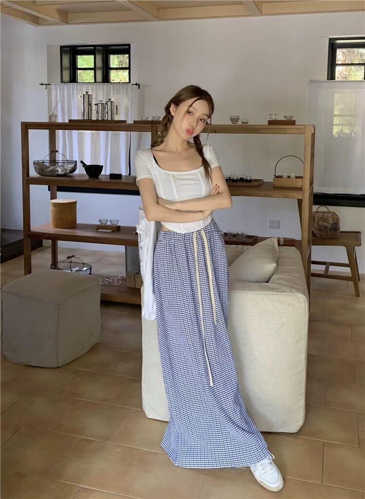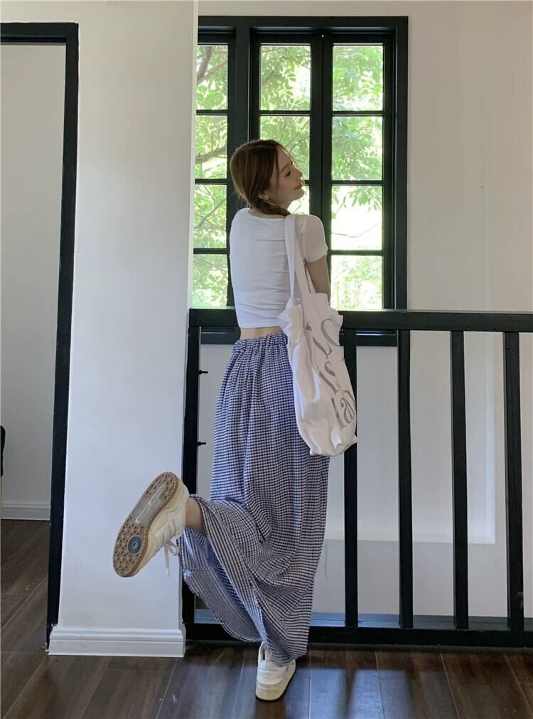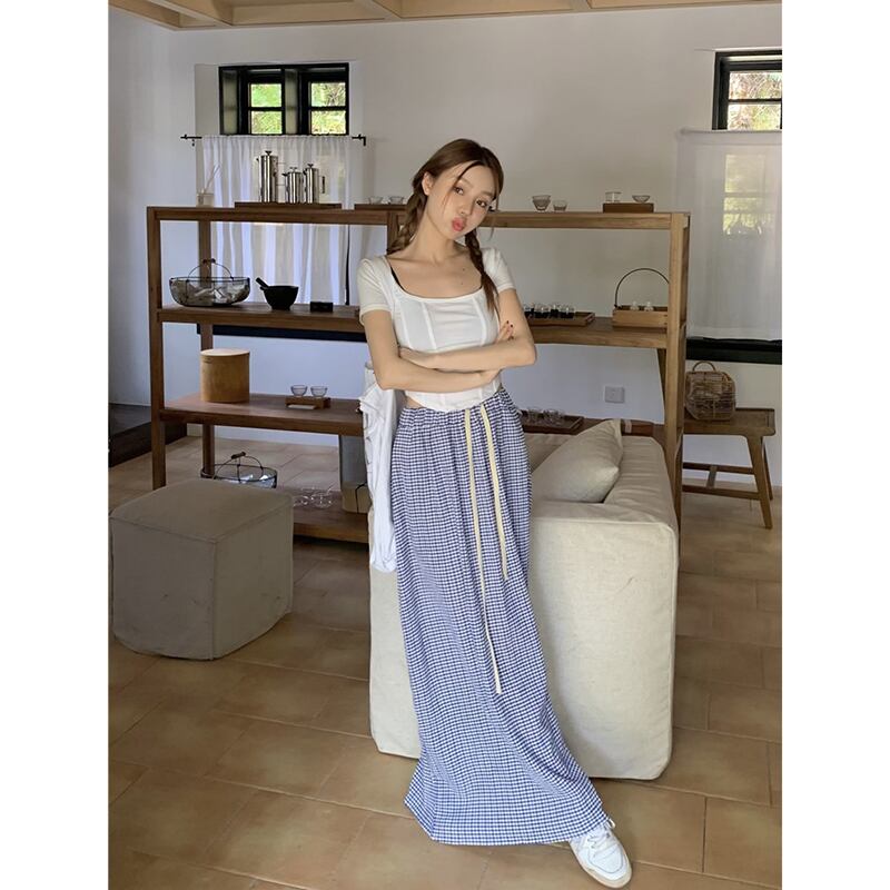 弾性ウエスト巾着チェック柄スカート女性の夏バージョン 2023 新しいハイウエスト薄いシックなシックなモップスカート ハイウェスト エラスティック 伸縮 サマー 夏物 missk69553940863