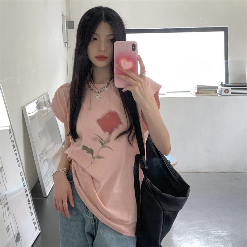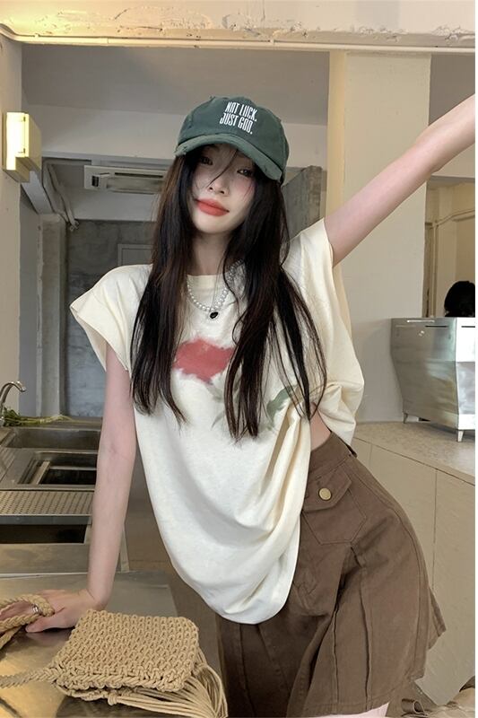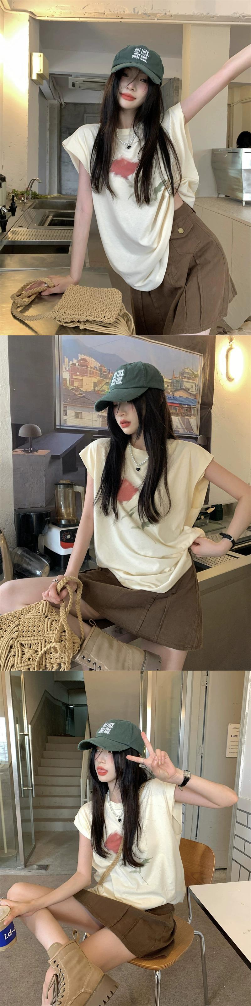 ノースリーブベスト Tシャツレディース夏 2023 新しいレトロ文学プリントルーズミッドレングスラウンドネックトップ サマー 夏物 Oネック missk59280512605