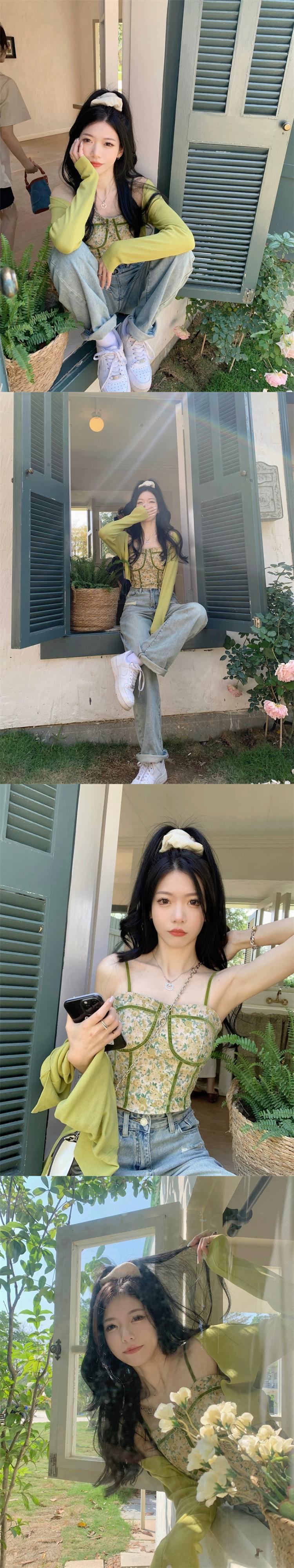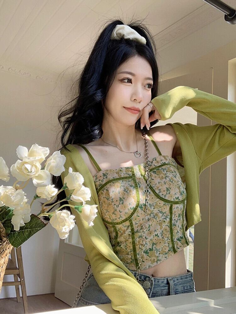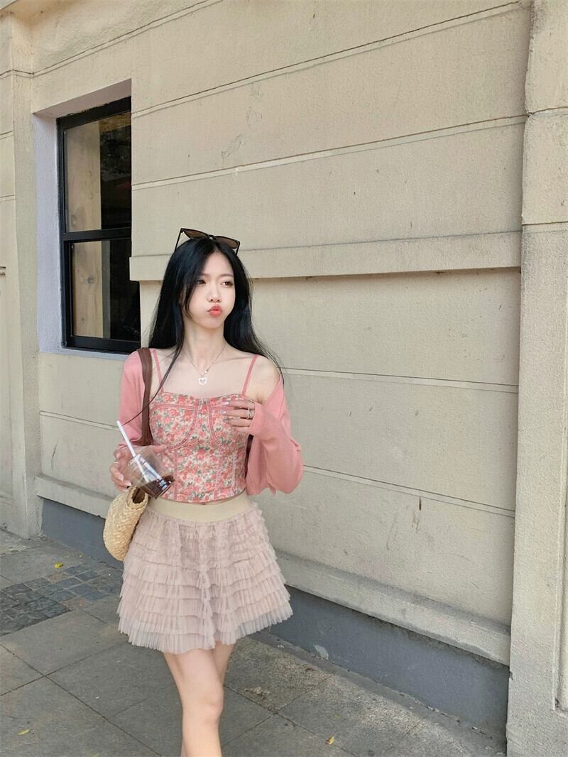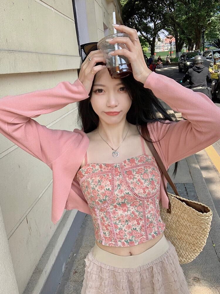 セクシーな花柄スリングスーツ女性の春夏新作ショートニットカーディガンベスト付きピンク2点セット スプリング 春物 サマー 夏物 missk77143435290