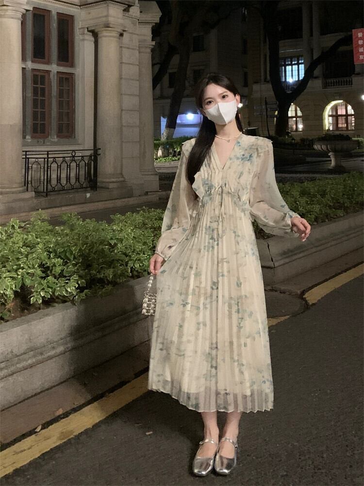 花柄シフォンドレスレディース2023夏新デザインセンスフレンチウエスト痩身Vネック長袖ティーブレイクスカート ロング サマー 夏物 missk69811207287