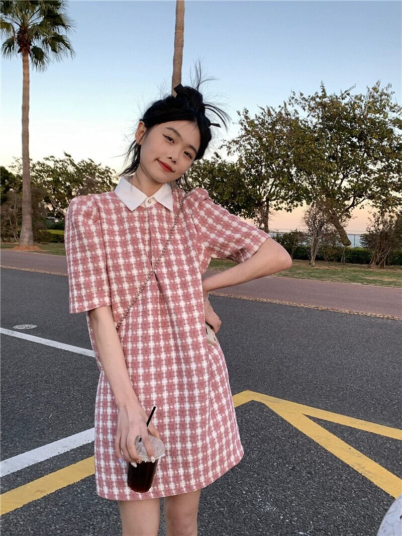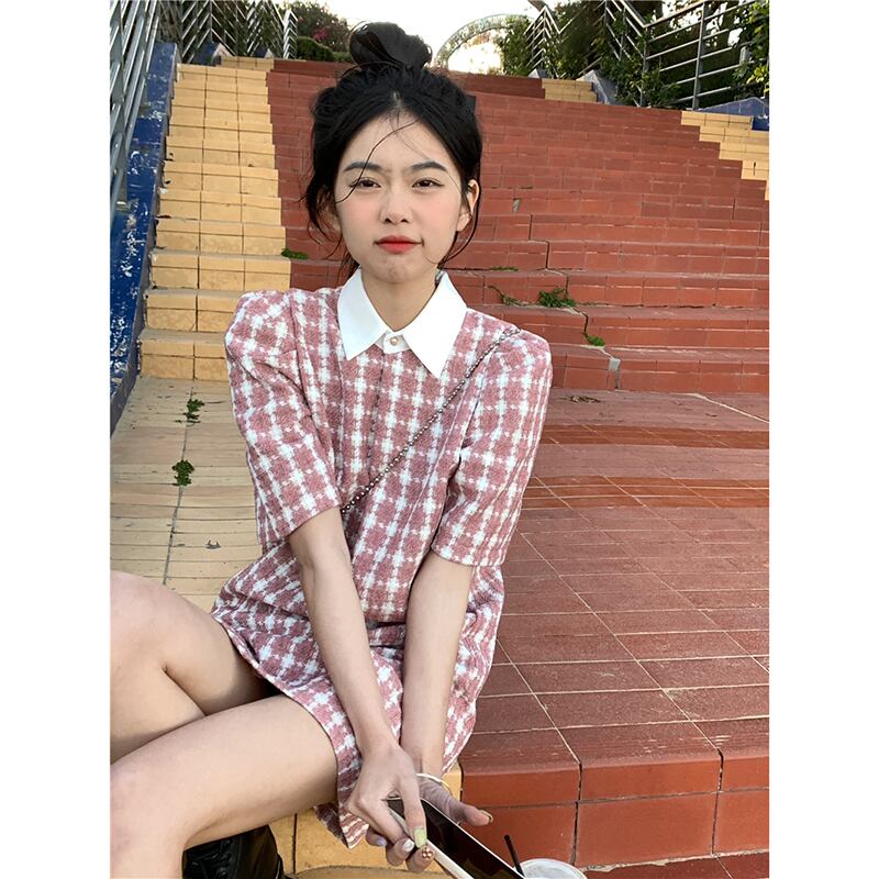ポロ襟チェック柄パフスリーブドレス女性の夏の 2023 新しいスタイル小さな香りの風非常に妖精の気質半袖スカート サマー 夏物 missk41116010926