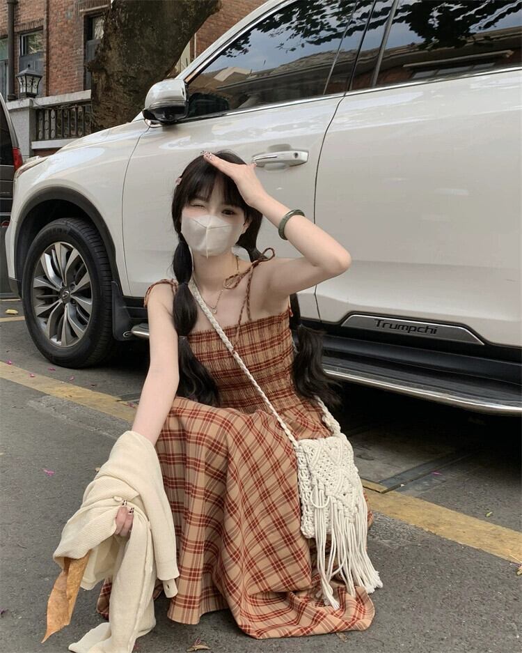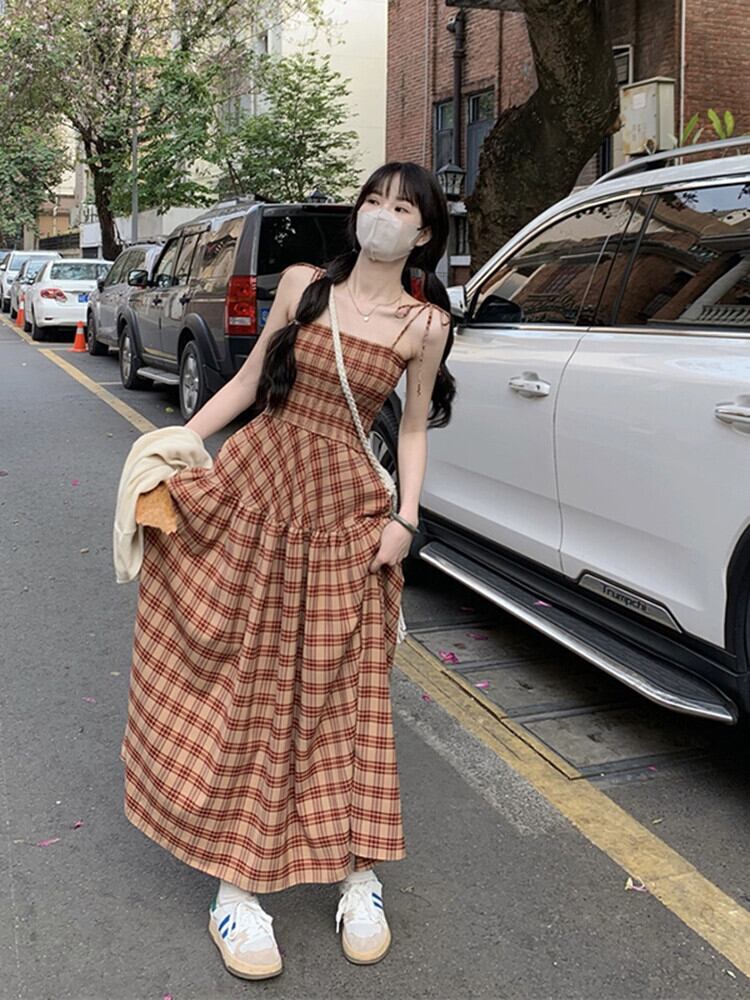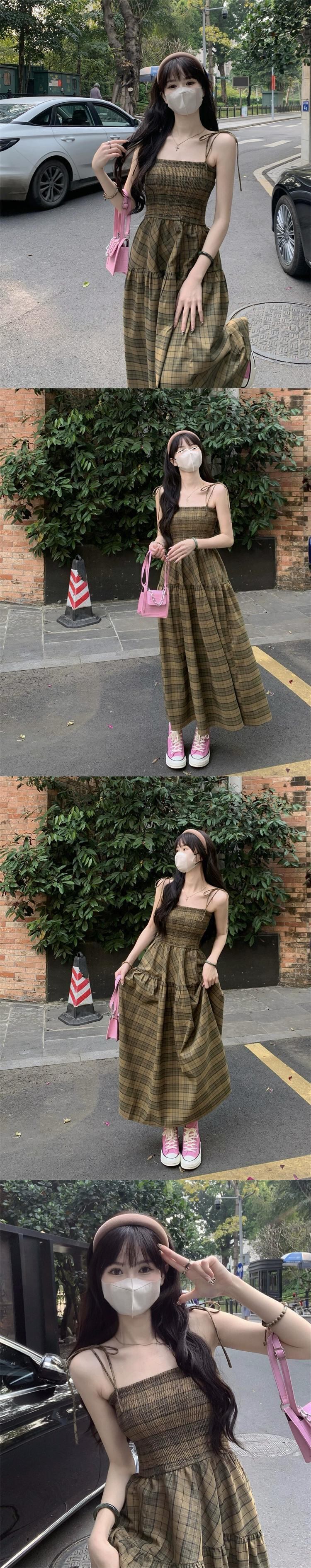 チェック柄サスペンダードレスレディース夏デザインセンスy気質プリーツノースリーブウエストウエストミドル丈大振りスカート サマー 夏物 missk14484328596